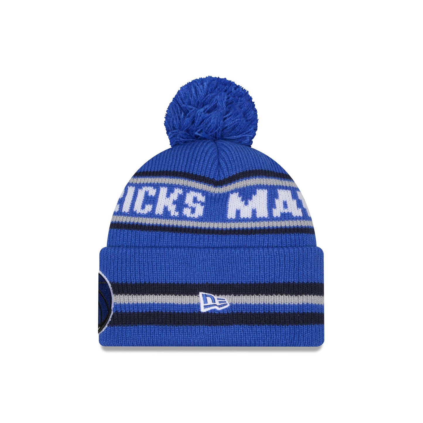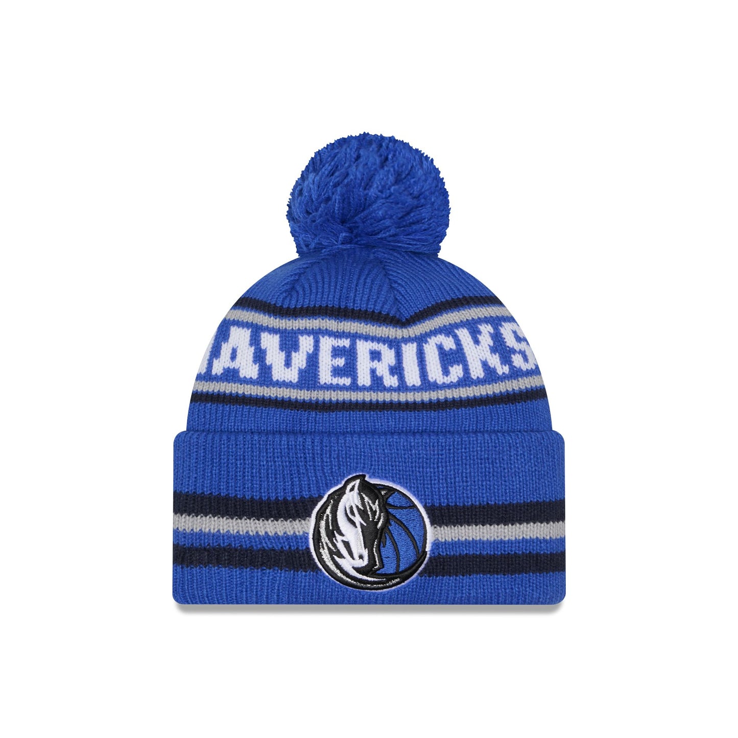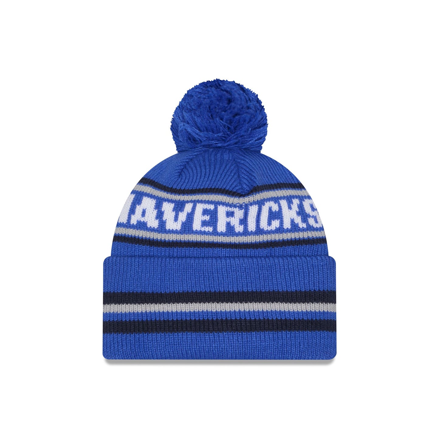 The Dallas Mavericks Classic Pom Knit Hat features an embroidered Mavericks logo at the front cuff with a wordmark at the crown and a one-time removable pom.