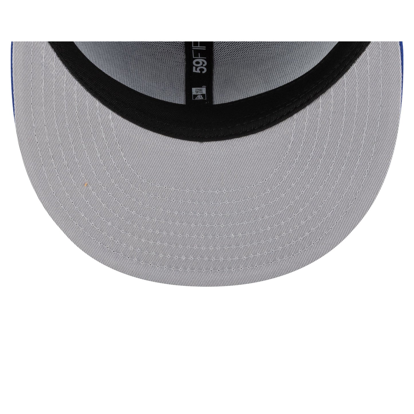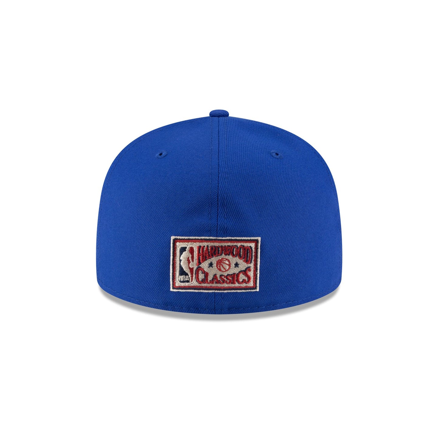 The Dallas Mavericks 1980-2000 Hardwood Classics Blue 59FIFTY Fitted Cap features an embroidered vintage Mavericks logo at the front panels with a 2010 All-Star Game patch at the right-wear side. Additional details include a Hardwood Classics