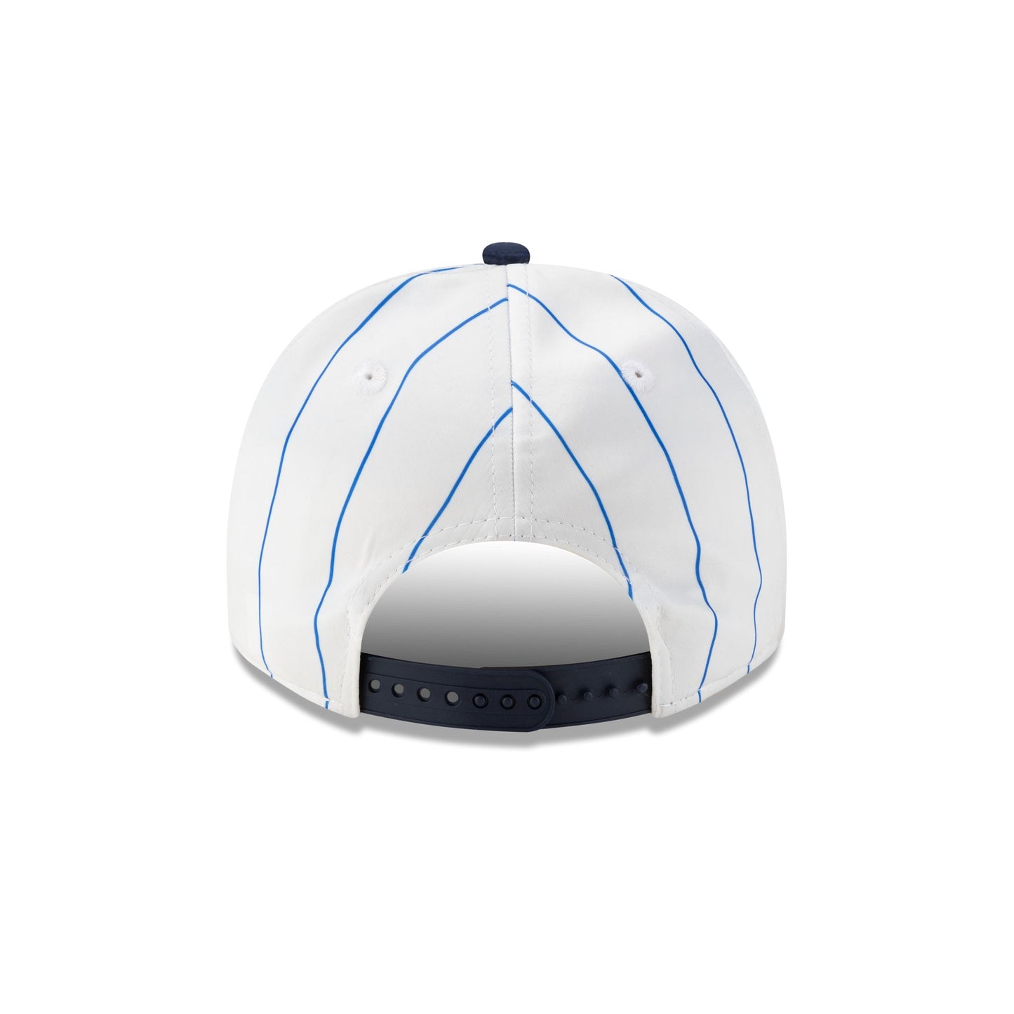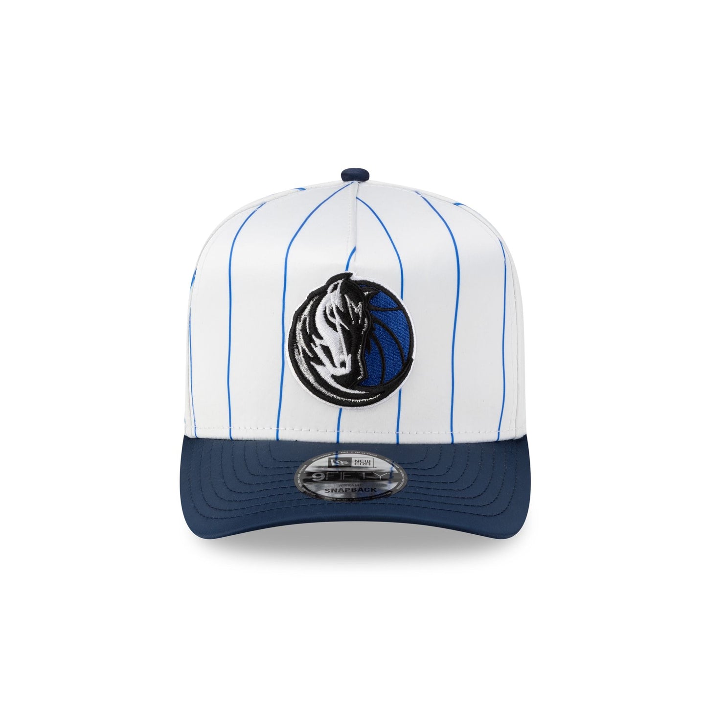 The Dallas Mavericks Satin Pinstripe 9FIFTY A-Frame Snapback features an embroidered Mavericks logo at the front panel with a team color visor, a gray undervisor, and a snapback closure at the rear.