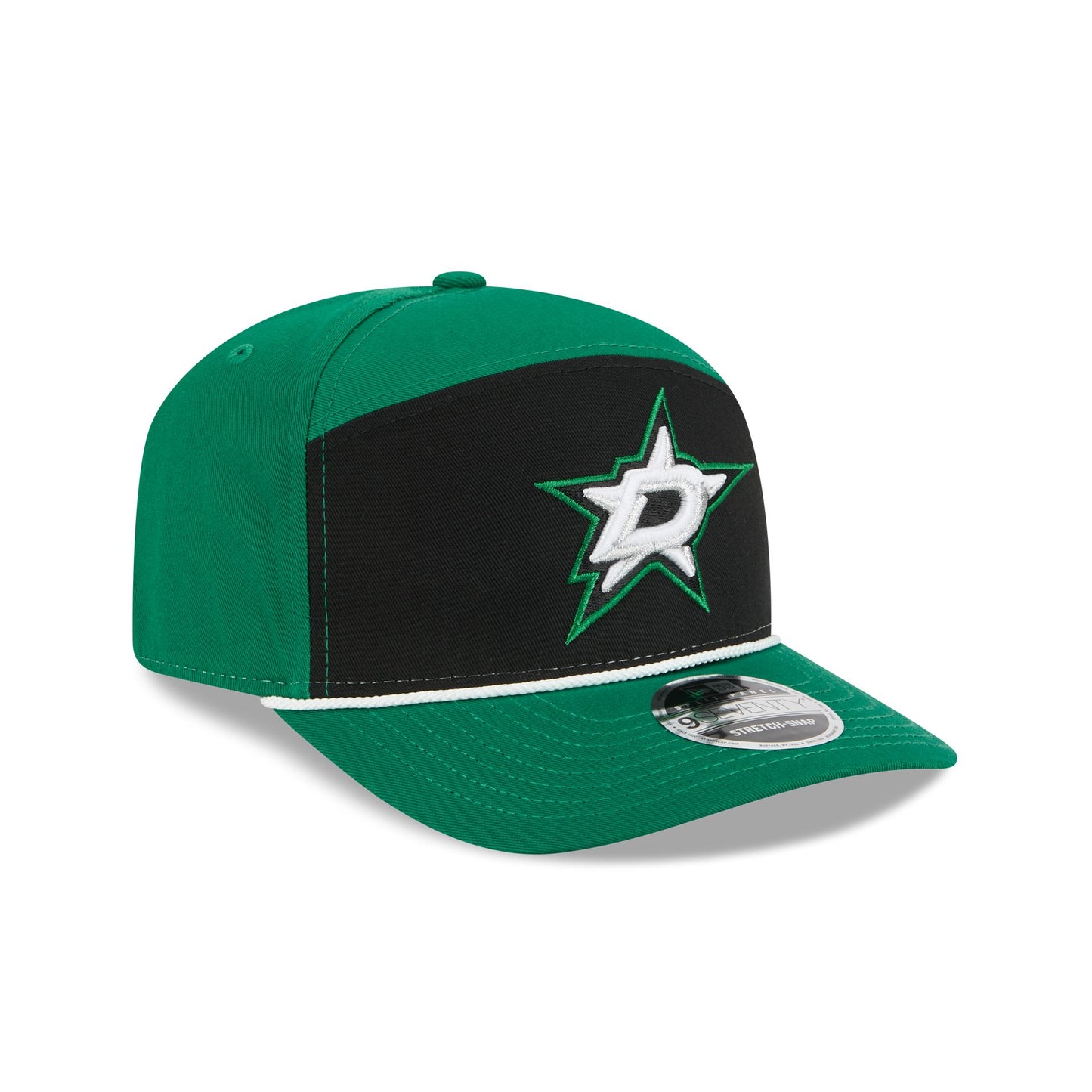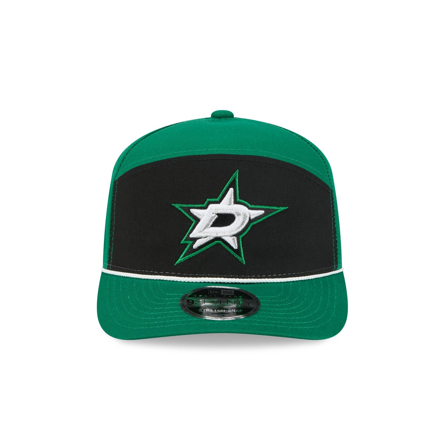 The Dallas Stars Split Panel 9SEVENTY Stretch-Snap features an embroidered Stars logo at the front panel with a split crown construction and a rope at the visor. Additional details include an adjustable stretch-snap closure at the rear and a gray undervisor.