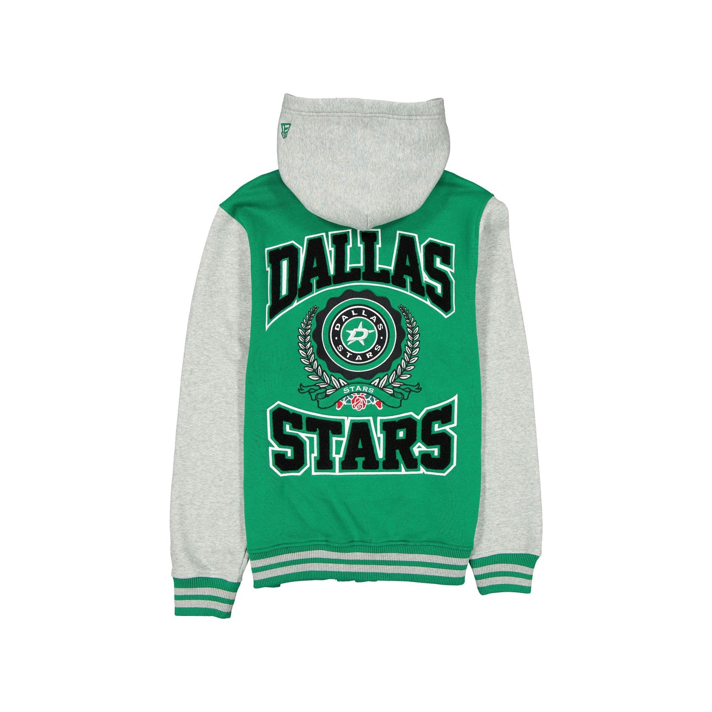 The Dallas Stars Throwback Prep Jacket features a chain-stitched Stars script at the right chest with a chenille applique team logo at the left chest. Additional details include a snap front closure with a chenille applique wordmark and team emblem at the rear.