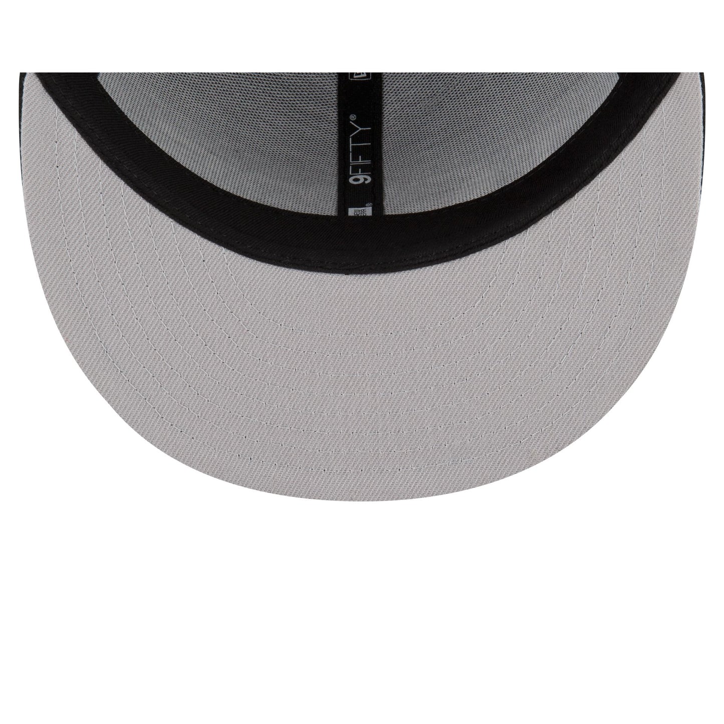 The Dallas Wings Rebel Series 9FIFTY Snapback features an embroidered Wings wordmark at the front panels with a team logo at the right-wear side, an adjustable snapback closure at the rear, and a gray undervisor.