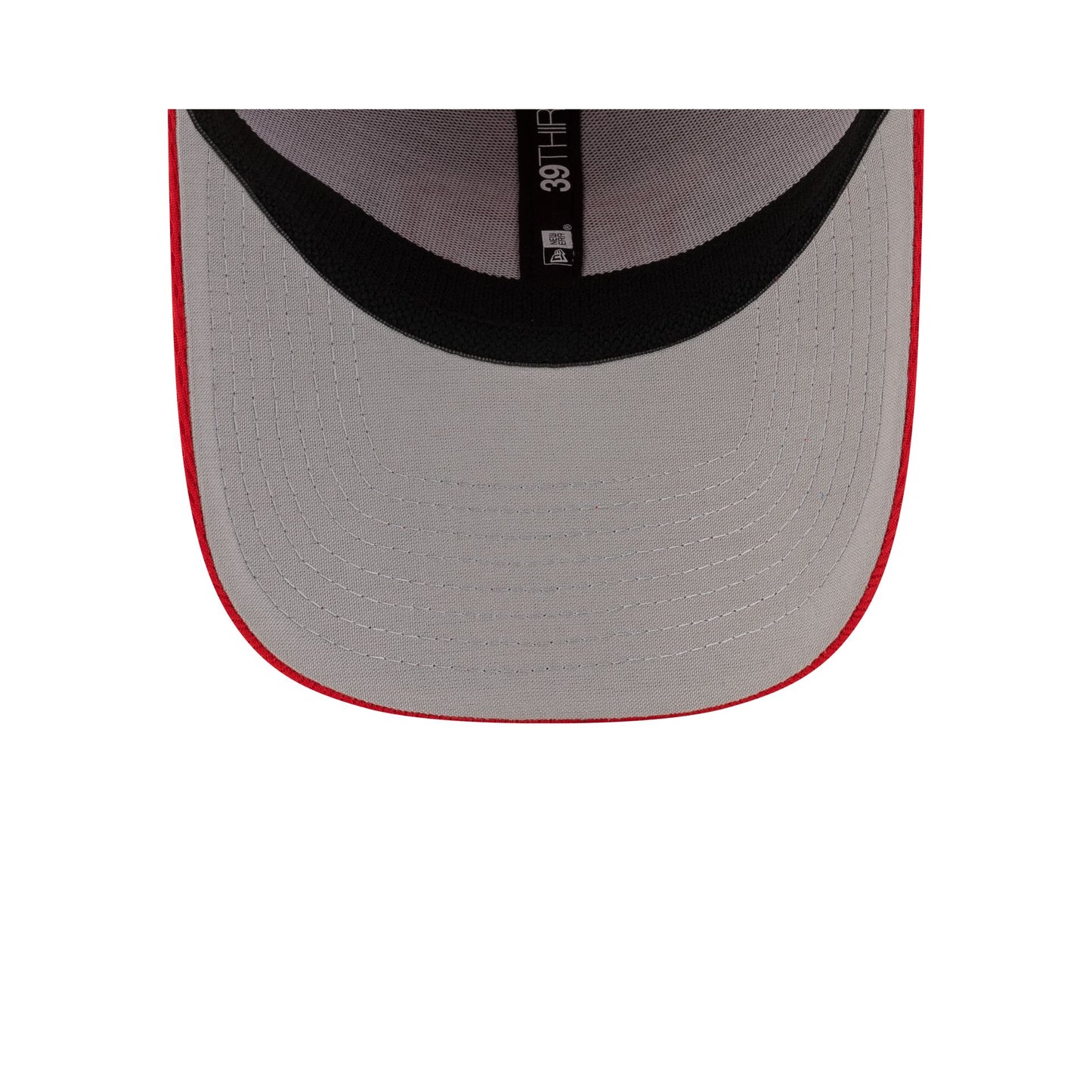 The DC Defenders Red 39THIRTY Stretch Fit Cap features an embroidered Defenders logo at the front panels with the New Era Flag at the left. Additional details include a UFL logo at the rear and a gray undervisor.