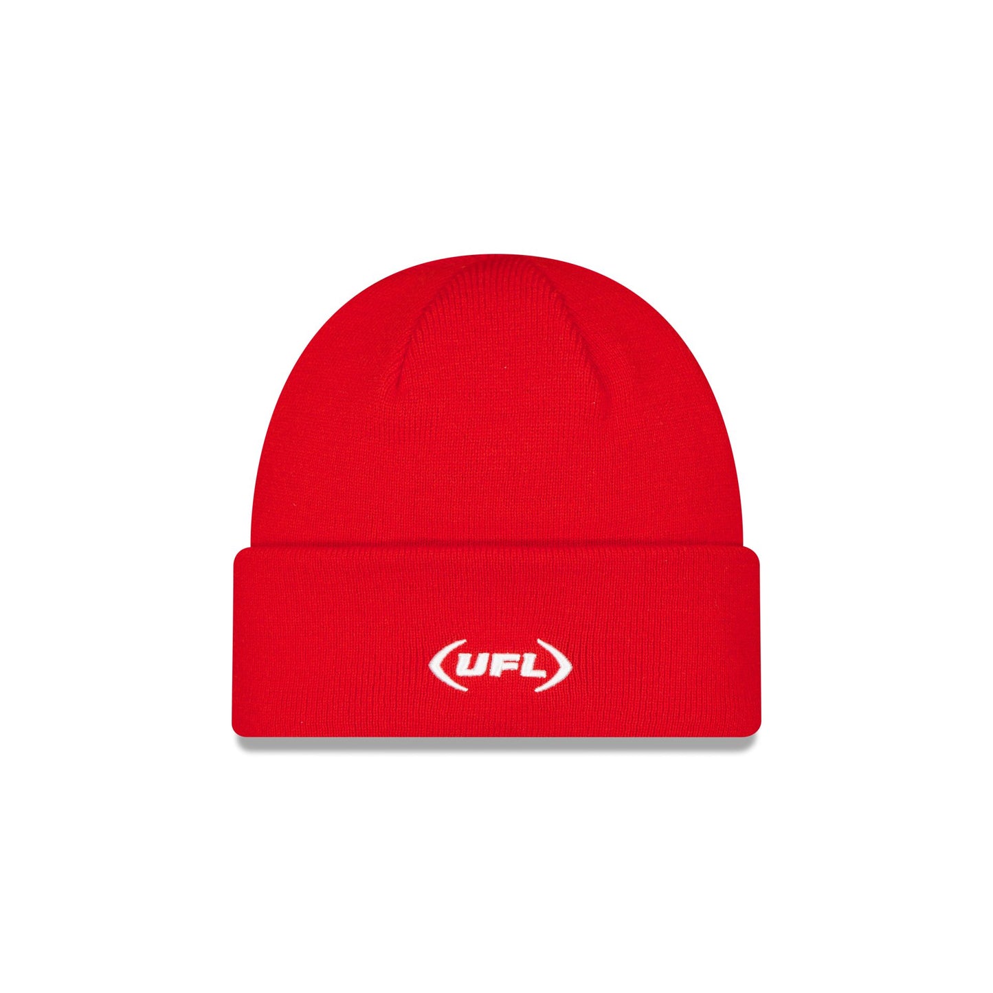 The DC Defenders Red Cuff Knit Beanie features an embroidered Defenders logo at the front cuff with a UFL logo at the rear.