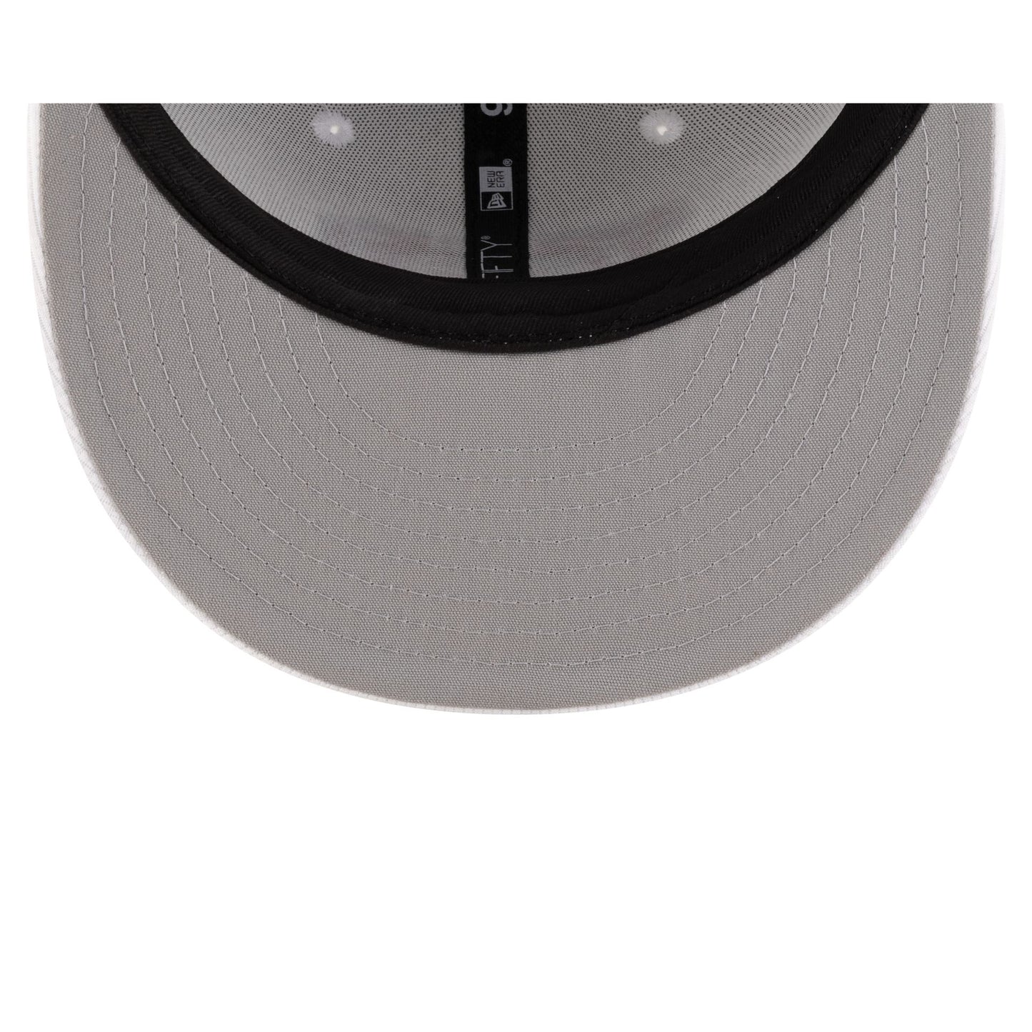The DC Defenders White 9FIFTY Snapback features an embroidered Defenders logo at the front panels with the New Era Flag at the left. Additional details include a UFL logo above a snapback closure at the rear and a gray undervisor.