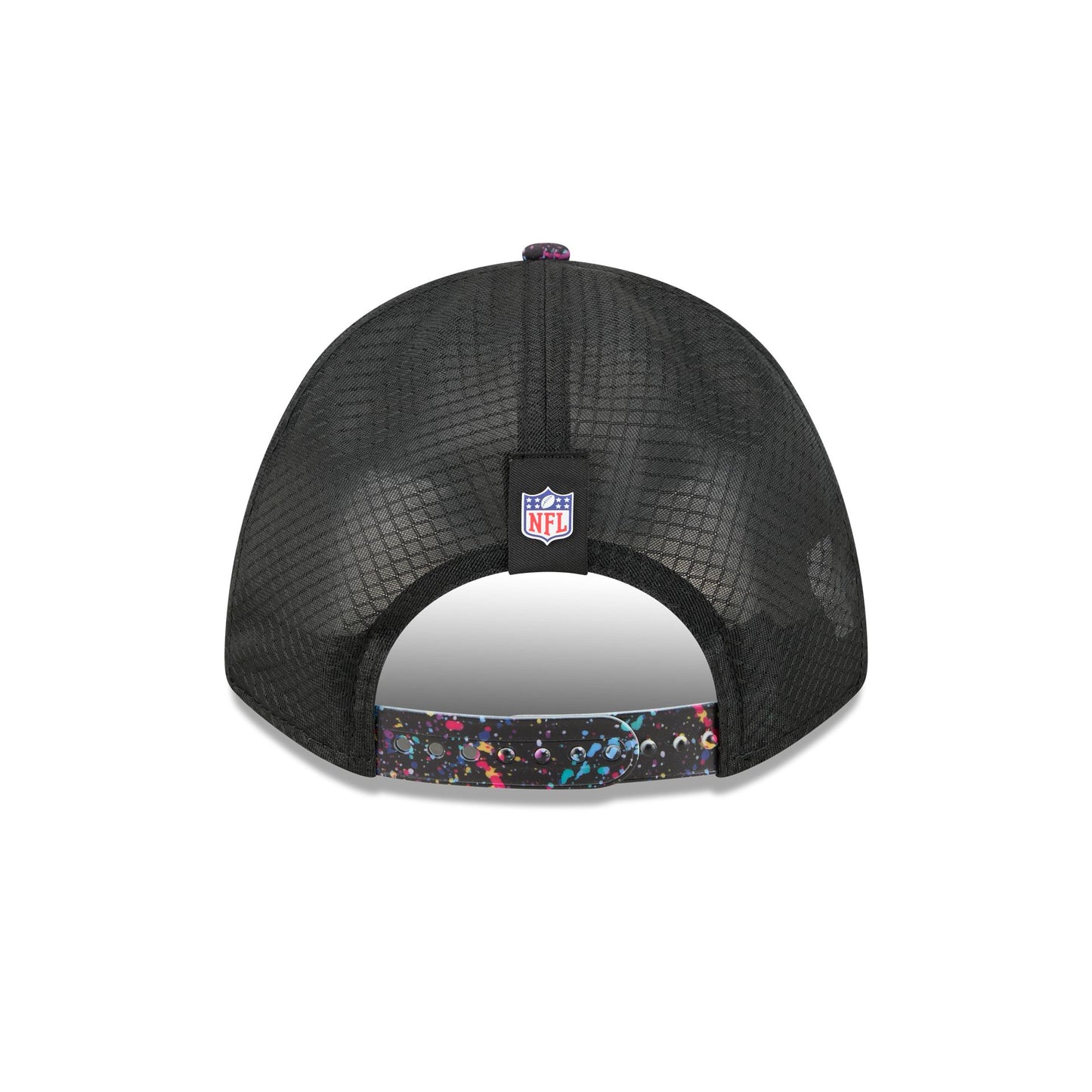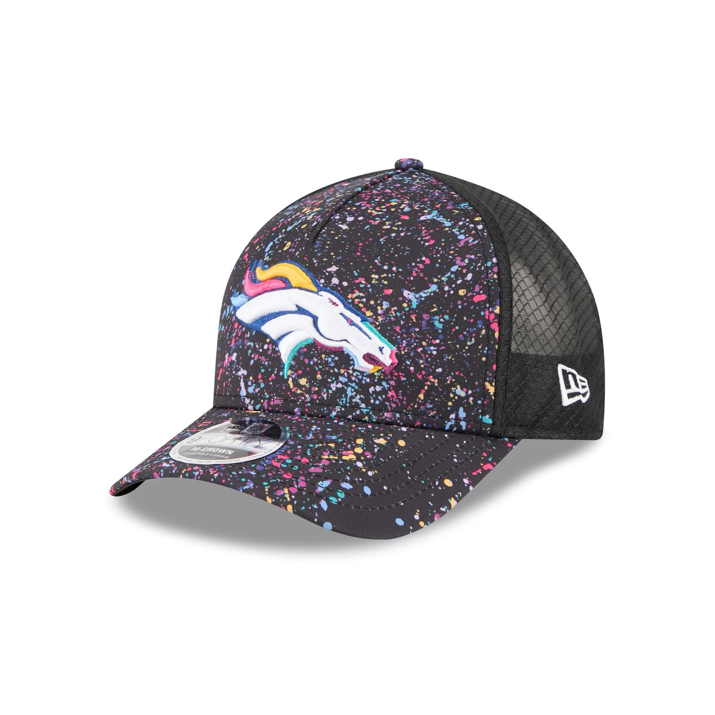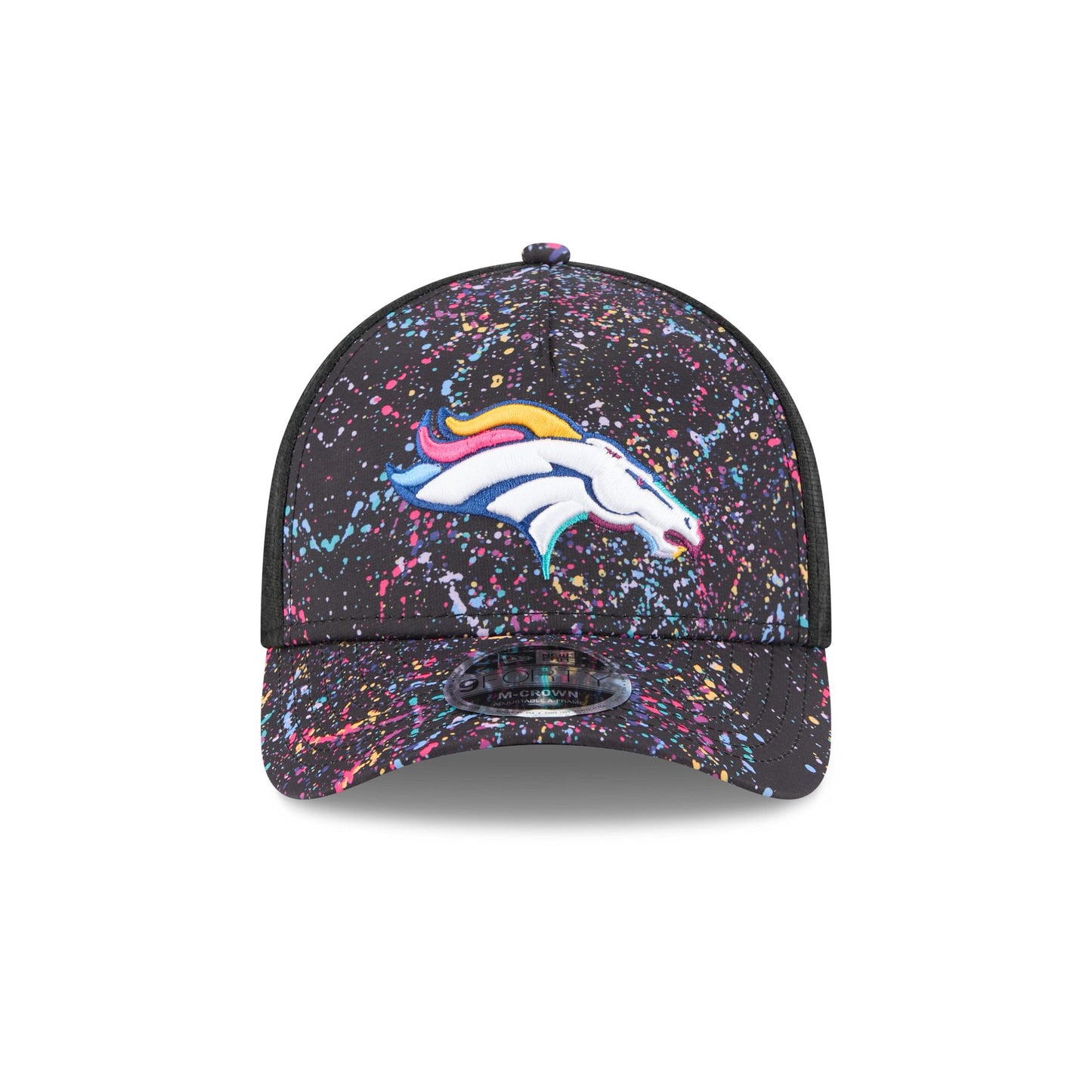 The Denver Broncos 2025 Crucial Catch 9FORTY M-Crown A-Frame Trucker features an embroidered Broncos logo at the front paint splatter panels with a woven NFL Shield tag above a snapback closure at the rear. Additional details include a Crucial Catch Intercept Cancer patch at the right-wear side with performance mesh rear panels and a black undervisor.