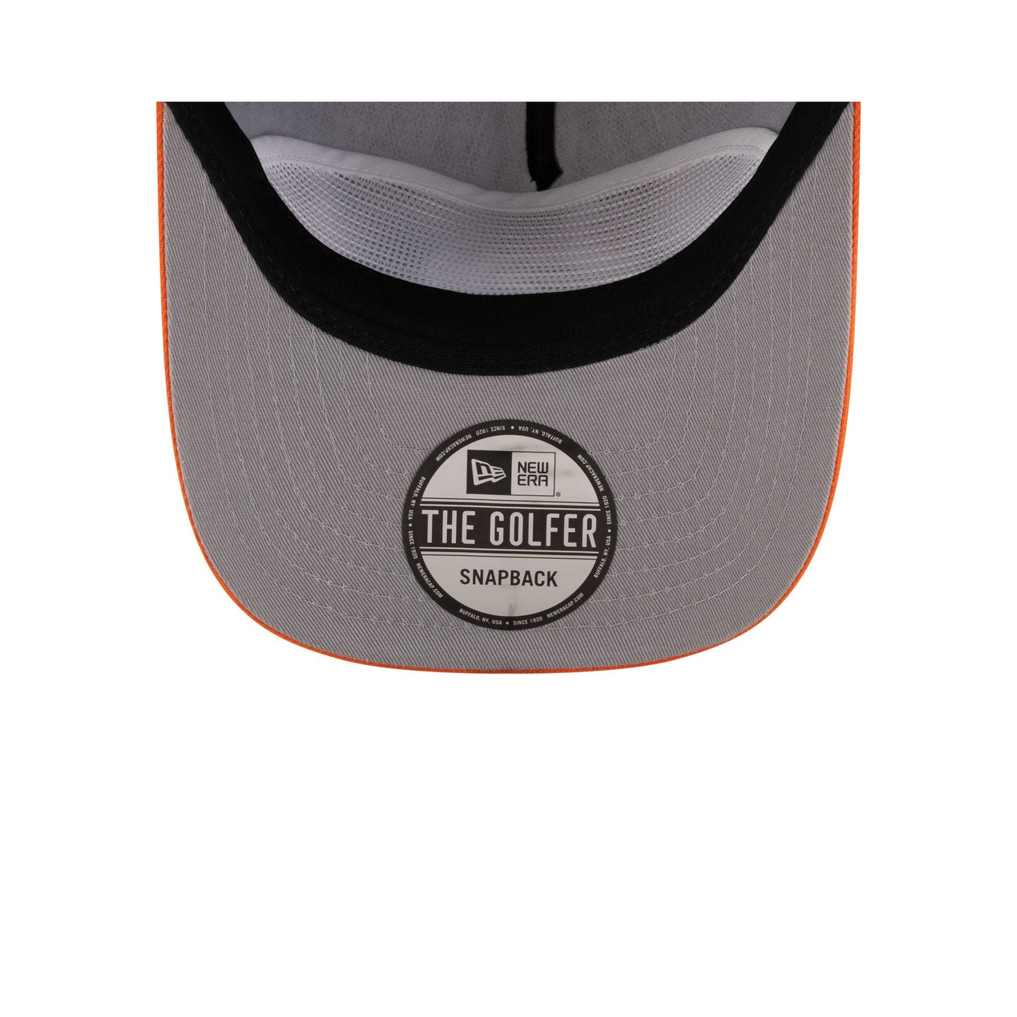 The Denver Broncos 2025 Draft Golfer features an embroidered Broncos logo and wordmark at the front panels with an NFL Shield logo above a snapback closure at the rear. Additional details include ornamental stitched details at the visor and a gray undervisor.
