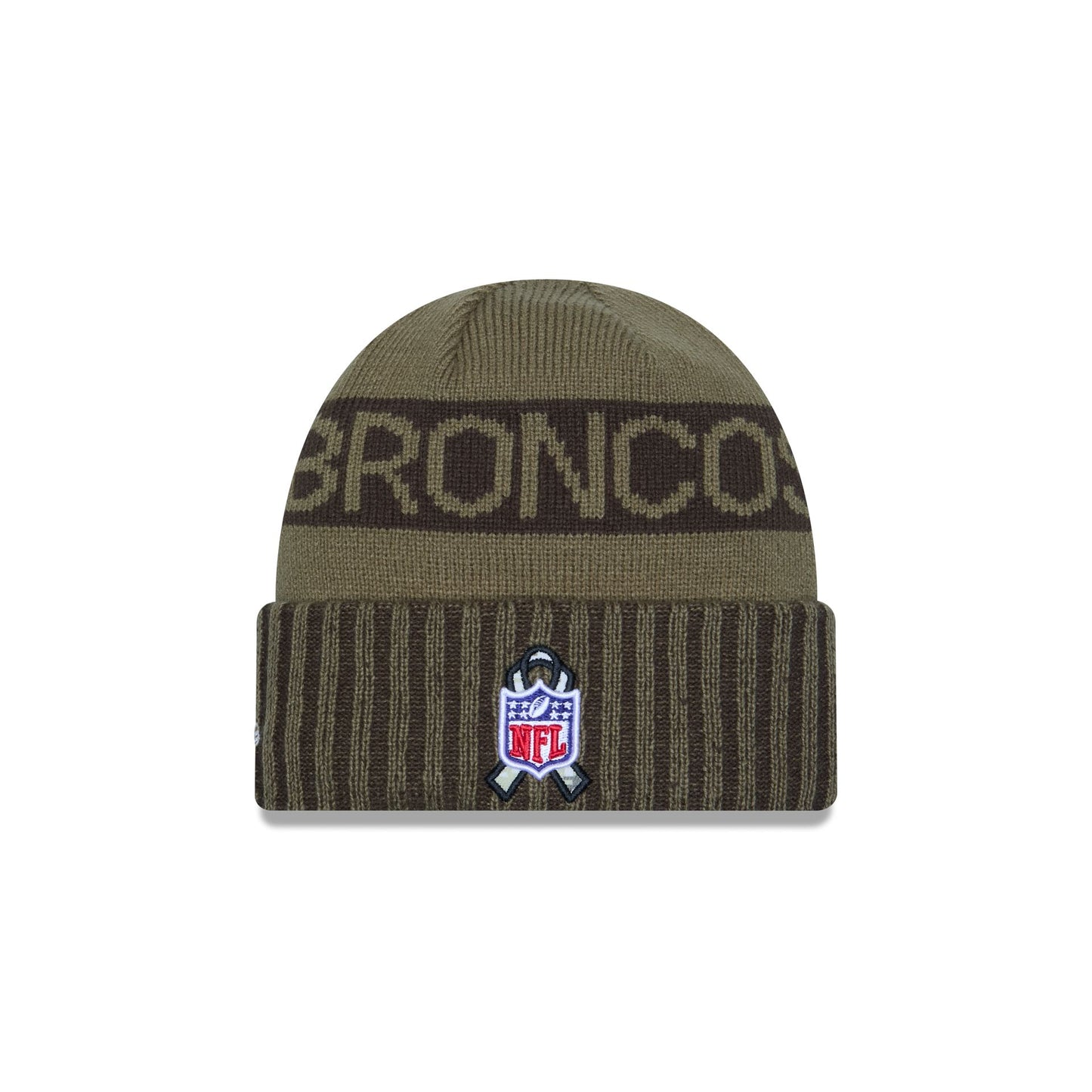 The Denver Broncos 2025 Salute to Service Cuff Knit features an embroidered Broncos logo at the front with a team wordmark at the crown, an American flag patch at the right-wear side, and the official NFL Salute to Service patch at the rear.