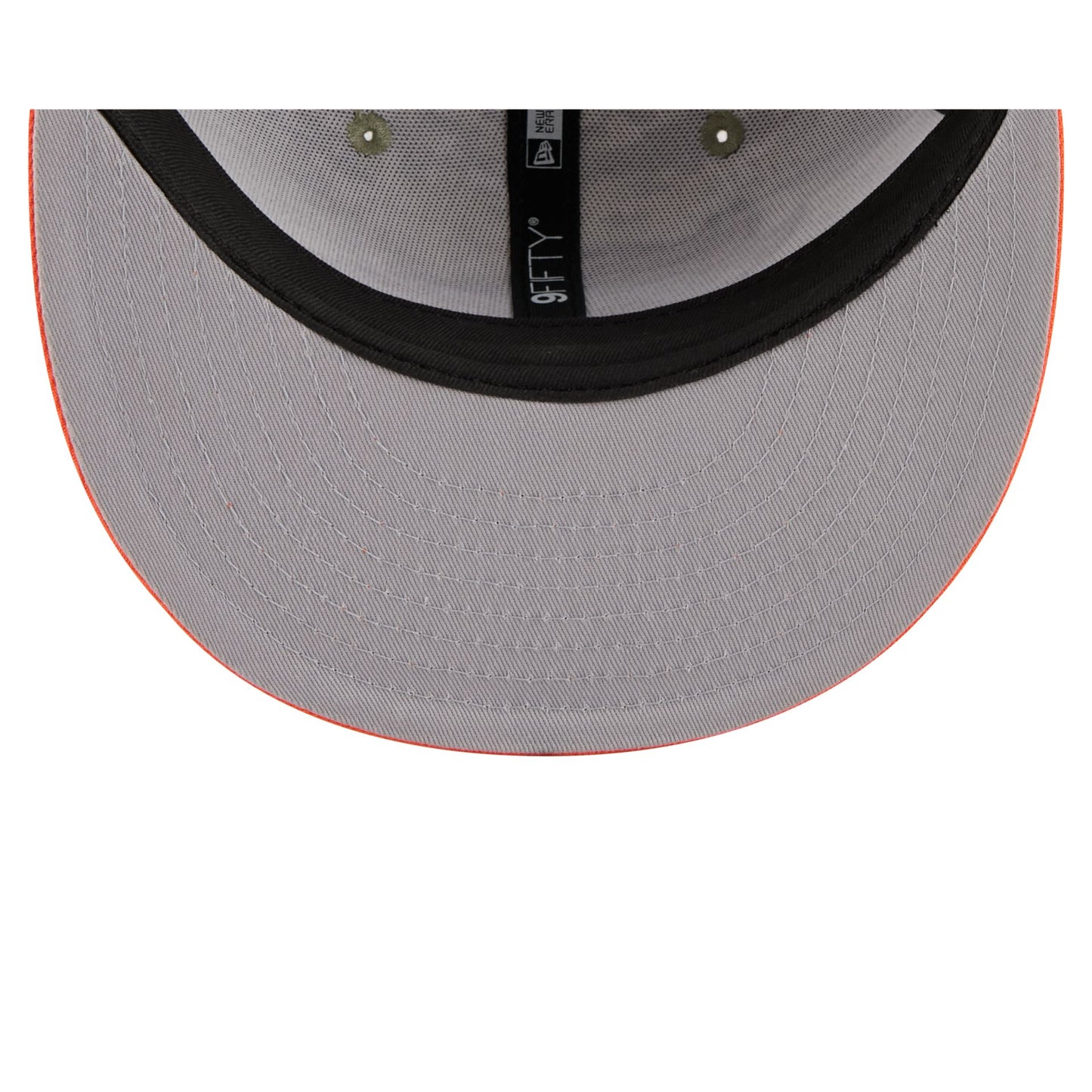 The Denver Broncos 2025 Salute to Service Fan Gear 9FIFTY Snapback features an embroidered Broncos logo at the front panels with the official NFL Salute to Service patch above a snapback closure at the rear. Additional details include an American flag patch at the right-wear side with team color visor and a gray undervisor.