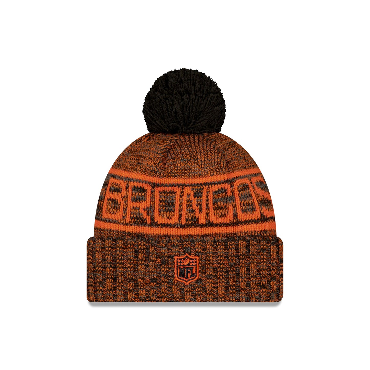 The Denver Broncos 2025 Sideline Cold Weather Black Pom Knit Hat features a sewn-down silicone Broncos black logo patch at the front cuff with a matching Official NFL Shield logo at the rear. Additional details include a team wordmark across the crown, a one-time removeable black pom, and a fleece lining.