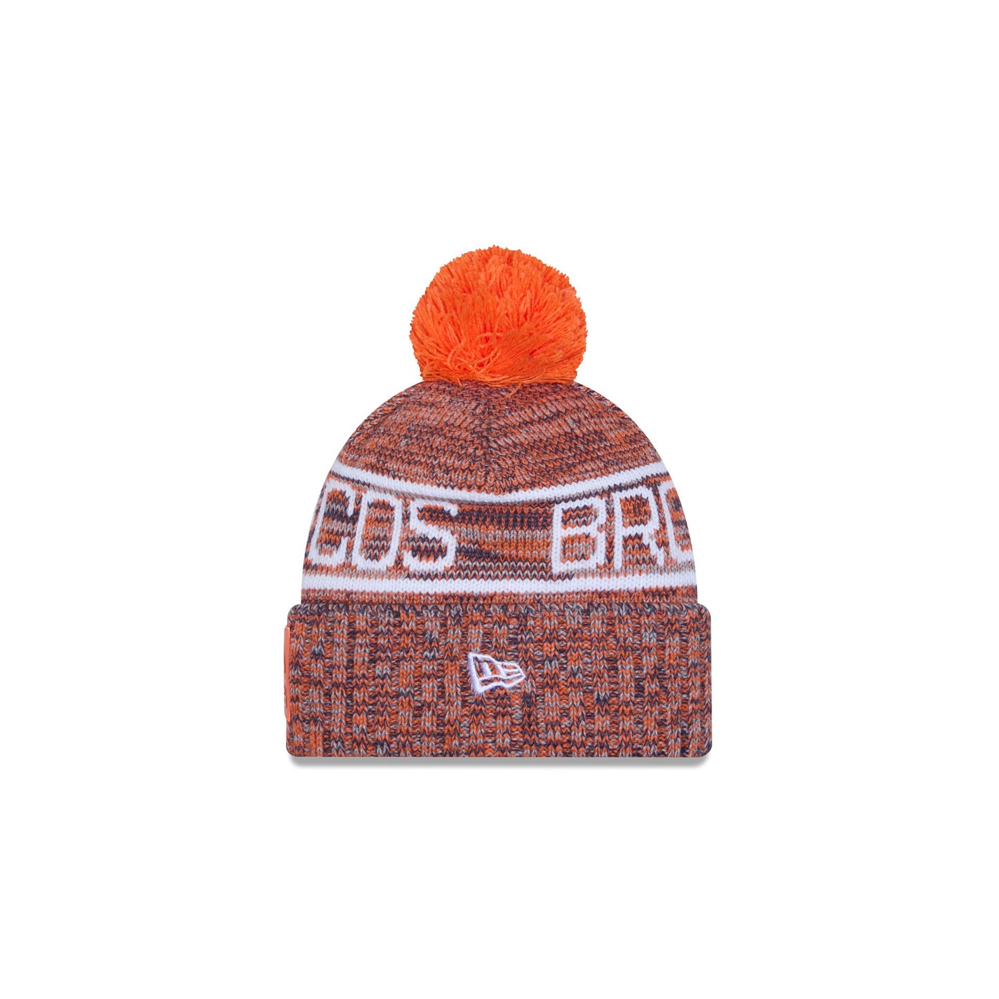 The Denver Broncos 2025 Sideline Cold Weather Kids Pom Knit features a sewn-down silicone Broncos logo patch at the front cuff with a matching Official NFL Shield logo at the rear. Additional details include a team wordmark across the crown, a one-time removeable pom, and a fleece lining.