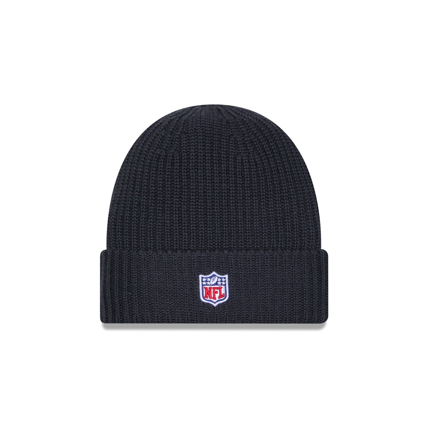The Denver Broncos 2025 Sideline Cold Weather Steel Clouds Cuff Knit Beanie features a sewn-down silicone Broncos logo patch at the front cuff with a matching Official NFL Shield logo at the rear. The beanie is knit from wool yarn and lined with fleece.