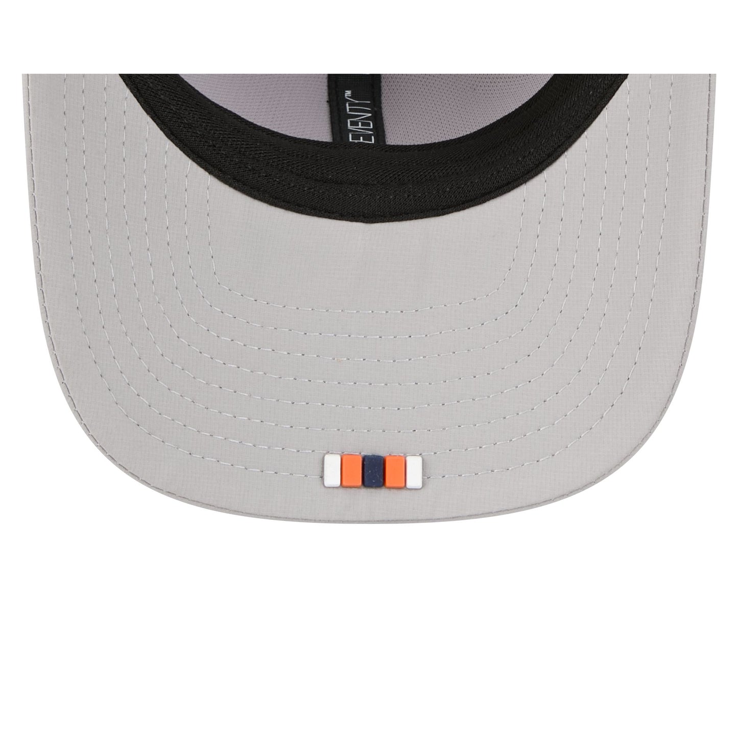 The Denver Broncos 2025 Sideline Hot Weather Gray 9SEVENTY Trucker features a sewn-down silicone Broncos logo patch at the front panels with a water-repellent quill tech fabrication throughout and a quick-dry cushioned sweatband to absorb moisture. Additional details include the Official NFL Shield logo to the right of a soft silicone snapback closure at a light-weight mesh rear. The undervisor is accented with a silicone transfer in the team’s colors.