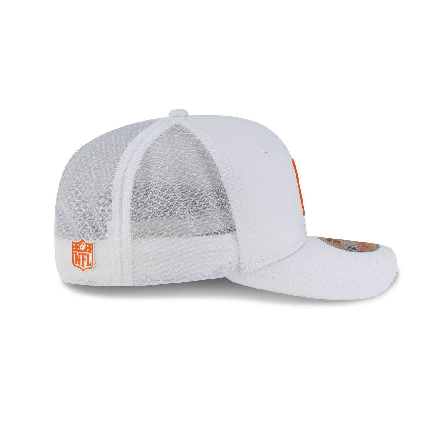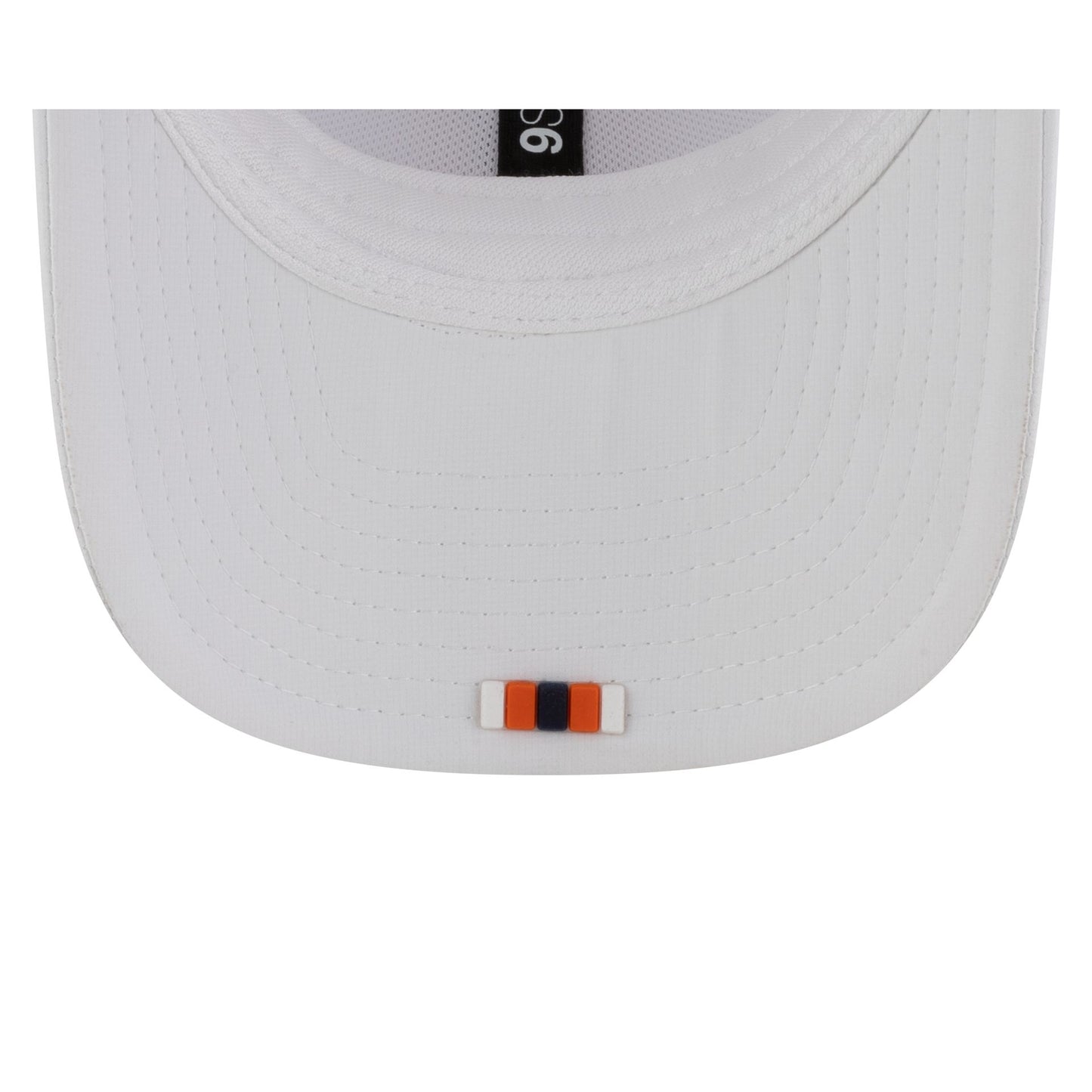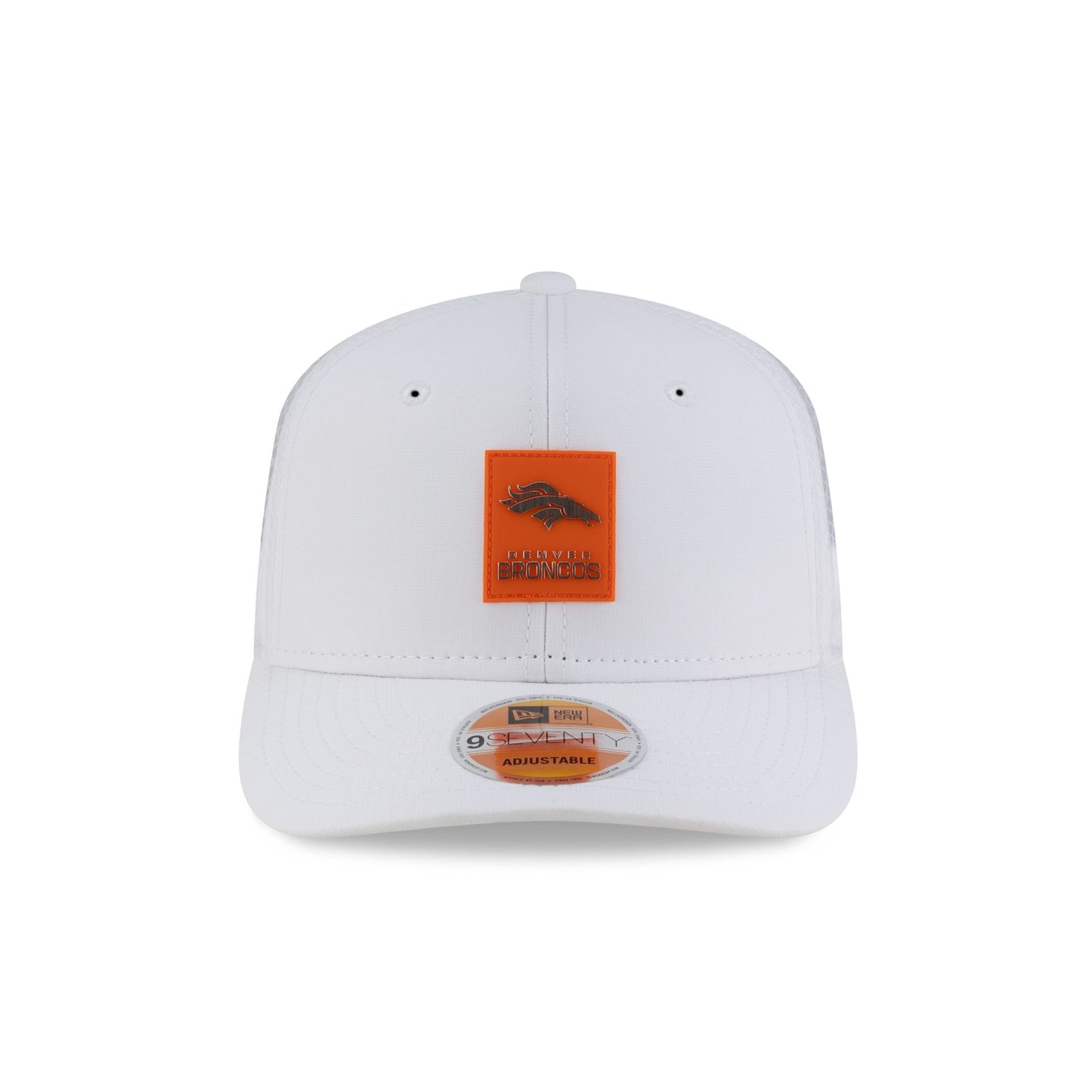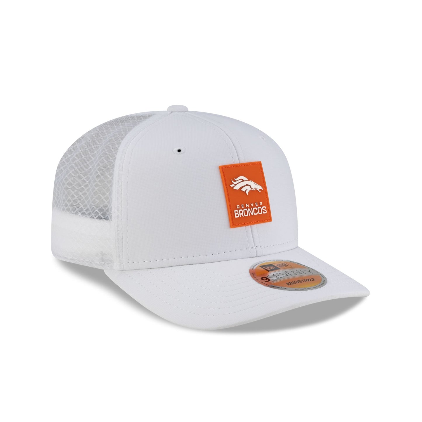 The Denver Broncos 2025 Sideline Hot Weather White 9SEVENTY Trucker features a sewn-down silicone Broncos logo patch at the front panels with a water-repellent quill tech fabrication throughout and a quick-dry cushioned sweatband to absorb moisture. Additional details include the Official NFL Shield logo to the right of a soft silicone snapback closure at a light-weight mesh rear. The undervisor is accented with a silicone transfer in the team’s colors.