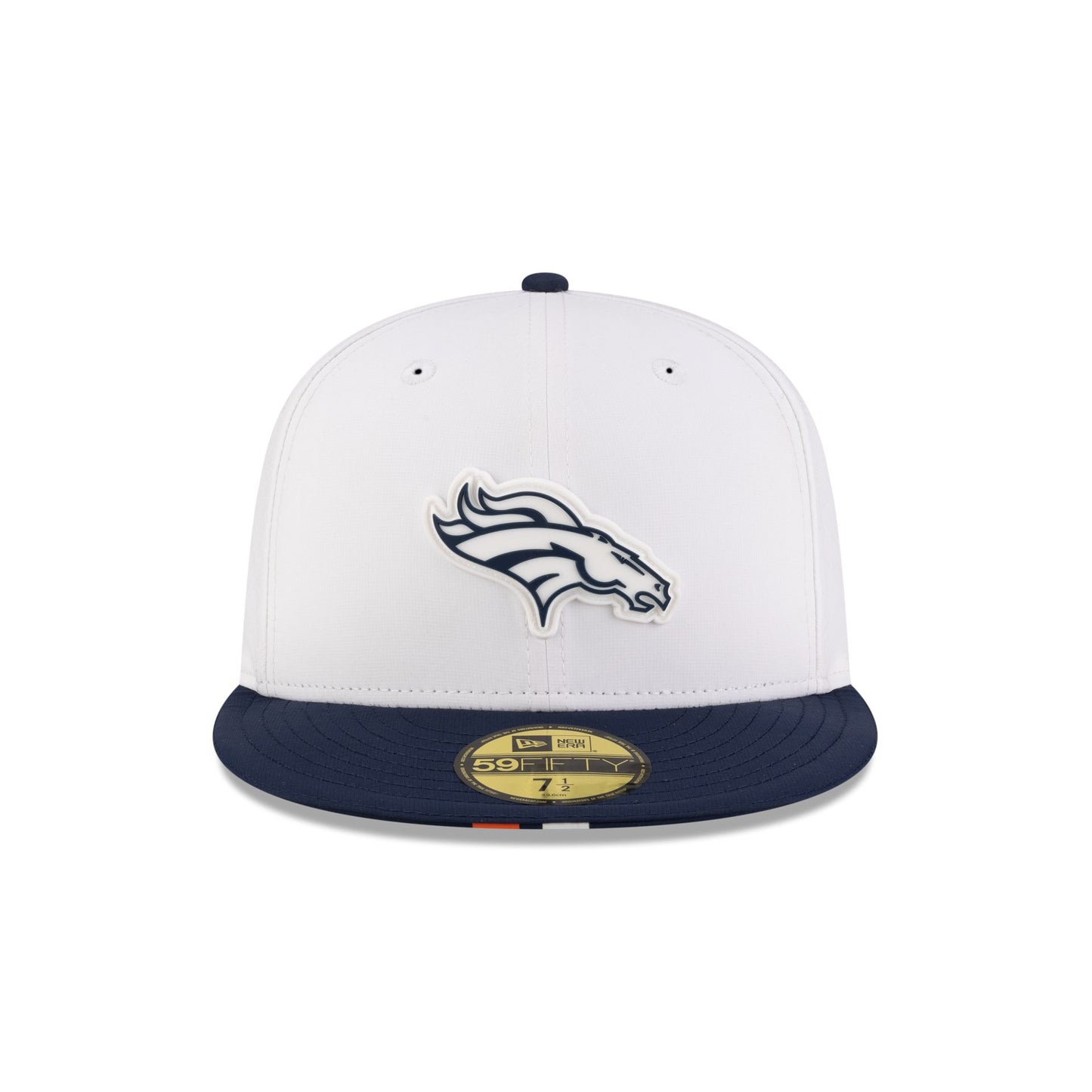 The Denver Broncos 2025 Training 59FIFTY Fitted Cap features a silicone Broncos patch at the front panels with team color stripes at the front of a navy visor and a silicone NFL Shield patch at the rear.