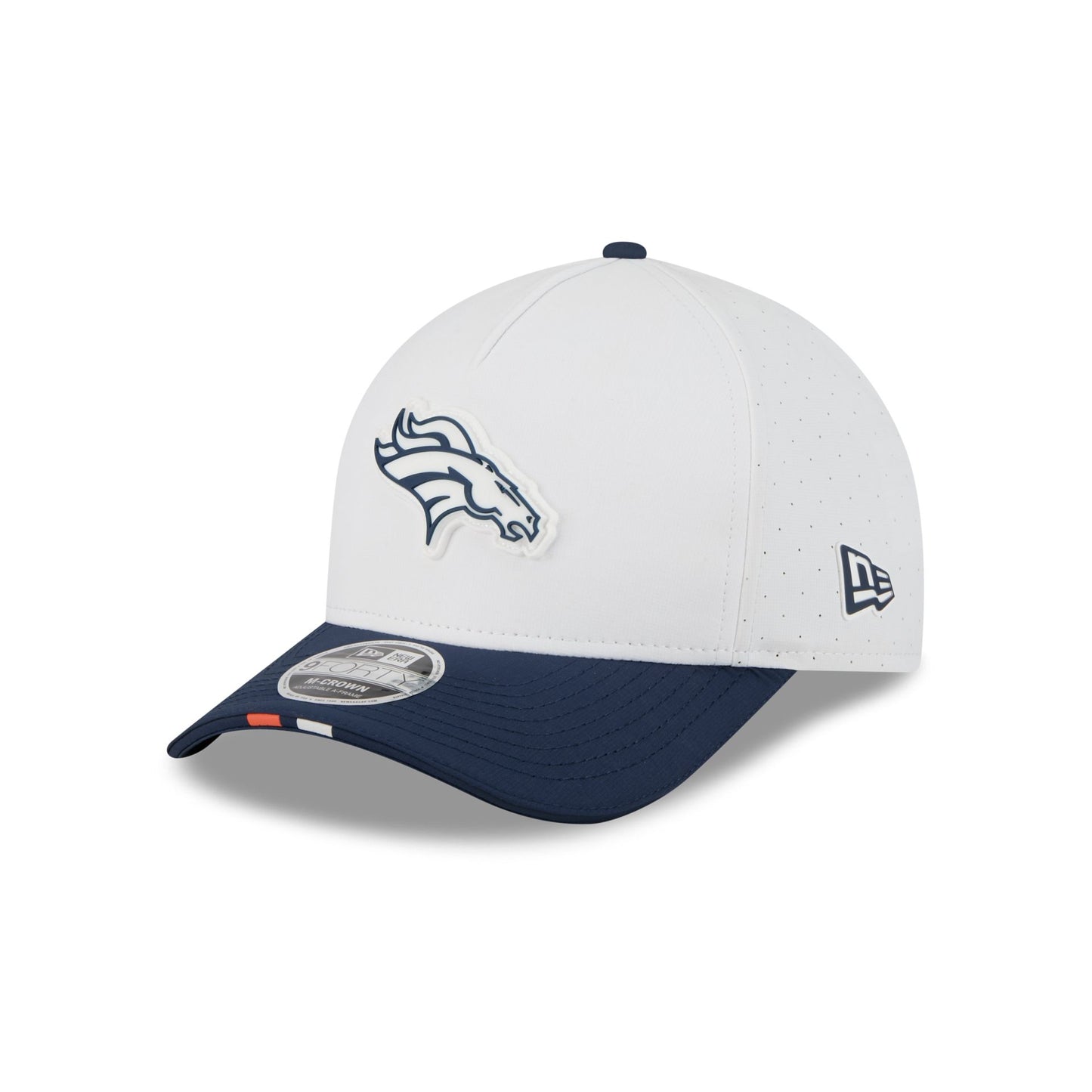 The Denver Broncos 2025 Training 9FORTY M-Crown A-Frame Snapback features a silicone Broncos patch at the front panel with team color stripes at the front of a navy visor. Additional details include a silicone NFL Shield patch on a woven foldover tab above a snapback closure at the rear.
