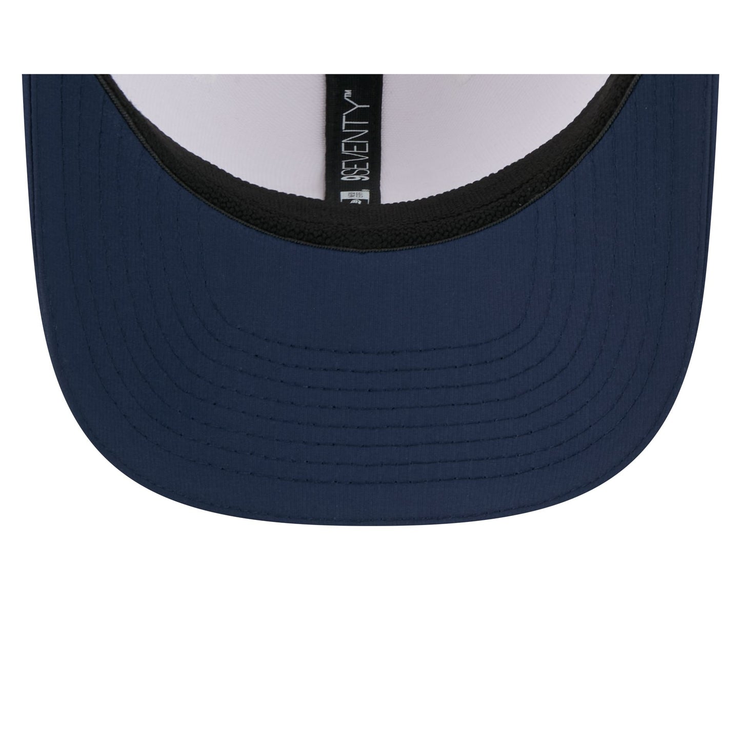 The Denver Broncos 2025 Training 9SEVENTY Stretch-Snap Cap features a silicone Broncos patch at the front panels with team color stripes at the front of a navy visor. Additional details include a silicone NFL Shield patch on a woven foldover tab above a snapback closure at the rear.