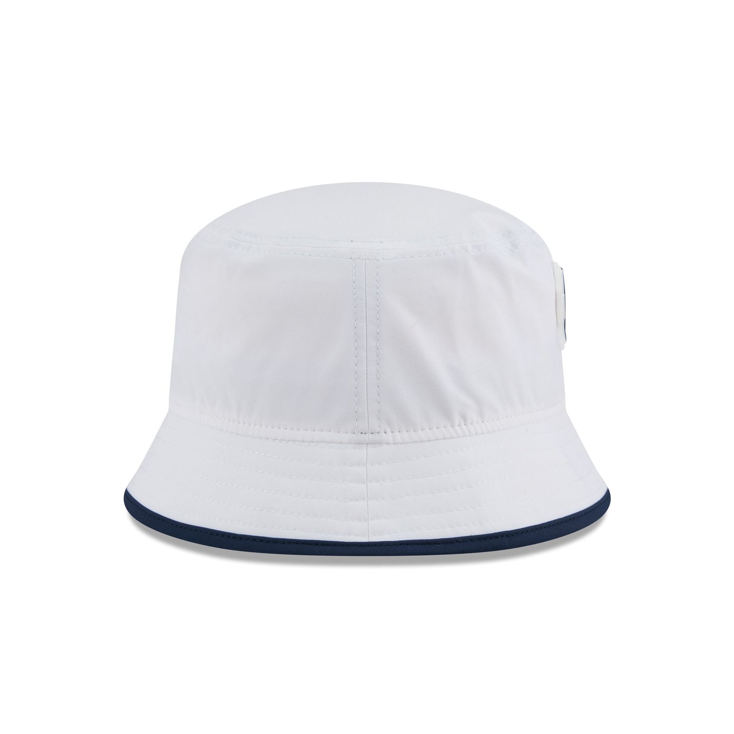 The Denver Broncos 2025 Training Bucket Hat features a silicone Broncos patch at the front panel with team color piping along the edge and a silicone NFL Shield patch on a woven foldover tab at the rear.
