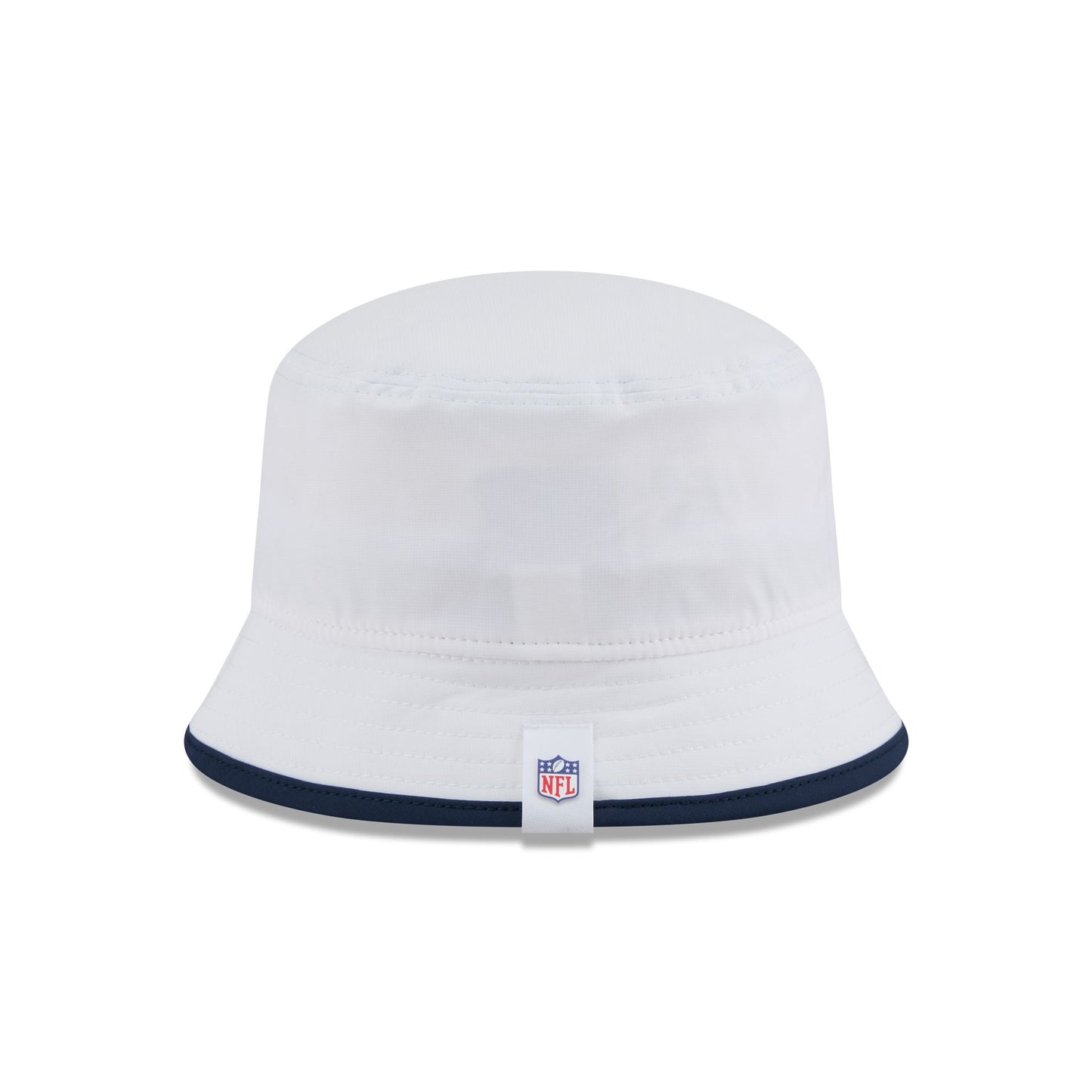 The Denver Broncos 2025 Training Bucket Hat features a silicone Broncos patch at the front panel with team color piping along the edge and a silicone NFL Shield patch on a woven foldover tab at the rear.