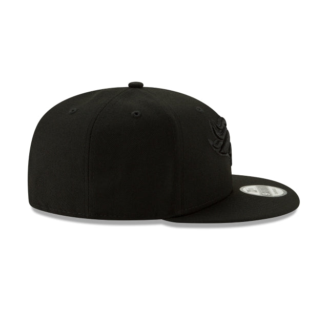 The Denver Broncos Black on Black 9FIFTY Snapback features an allover black fabrication with an embroidered Broncos logo at the front panels and an adjustable snapback closure at the rear.