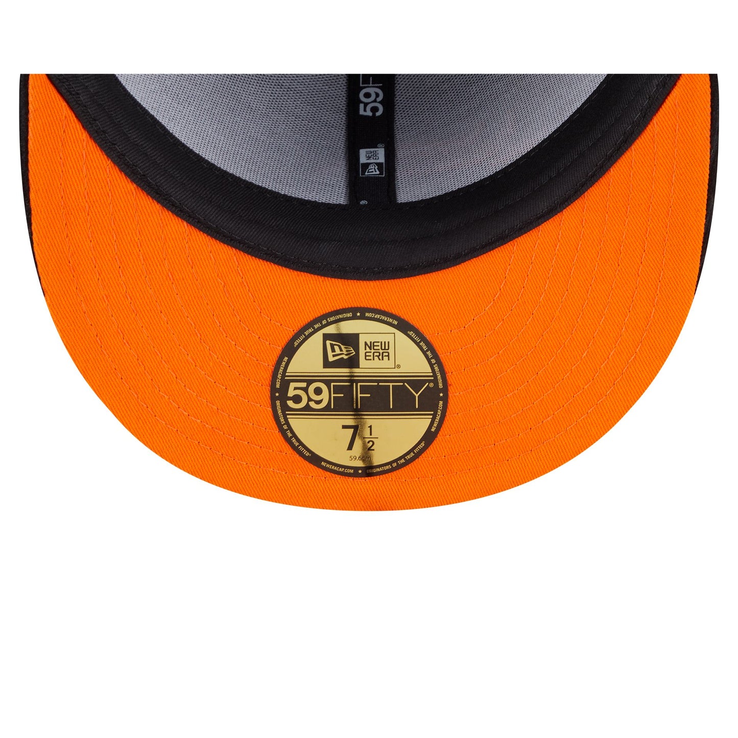 The Denver Broncos Color Pop Cord 59FIFTY Fitted Cap features an embroidered Broncos logo at the front panels against a black corduroy fabrication throughout and a matching NFL Shield at the rear. Additional details include a black logo at the right-wear side and an orange undervisor.