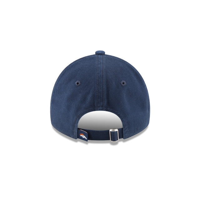 The Denver Broncos Core Classic Blue 9TWENTY Adjustable Cap features an embroidered Broncos logo at the front panels offset by the New Era flag embroidered on the left-wear side and a woven tab displaying an alternate logo at the rear alongside an adjustable D-Ring closure.