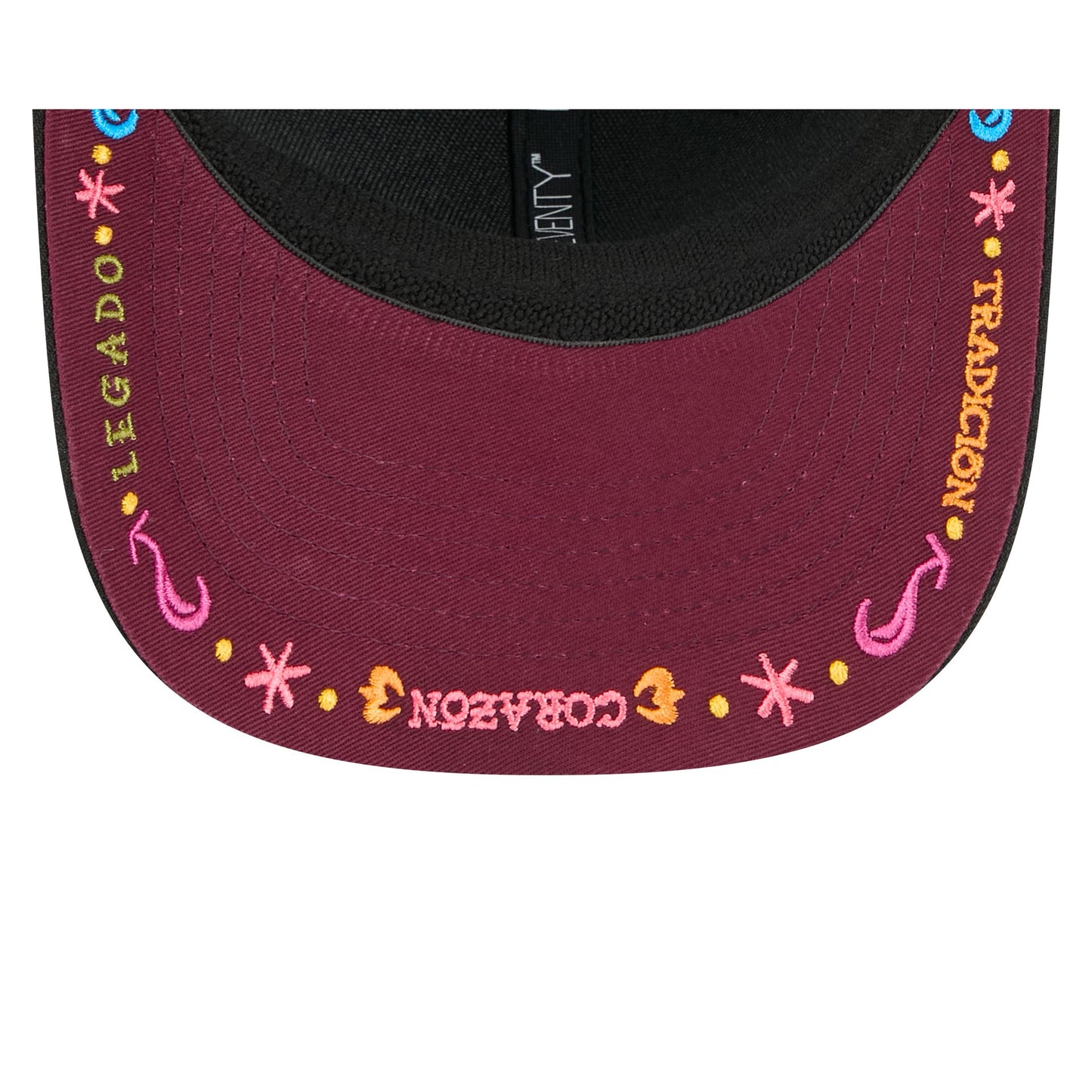 The Denver Broncos Hasta La Muerte 9SEVENTY Stretch-Snap features an embroidered Broncos logo and Day of the Dead design at the front panels. Additional details include design at the visor, and an undervisor that reads: Tradición, Corazón y Legado, meaning Tradition, Heart and Legacy. A matching NFL Shield is shown at the rear with an adjustable snapback closure.
