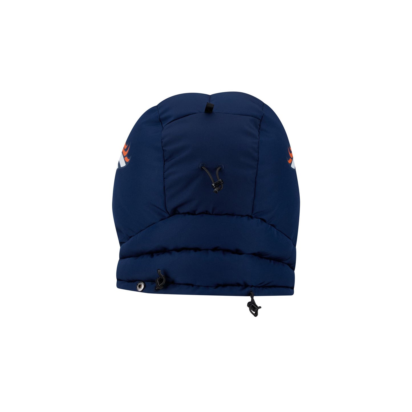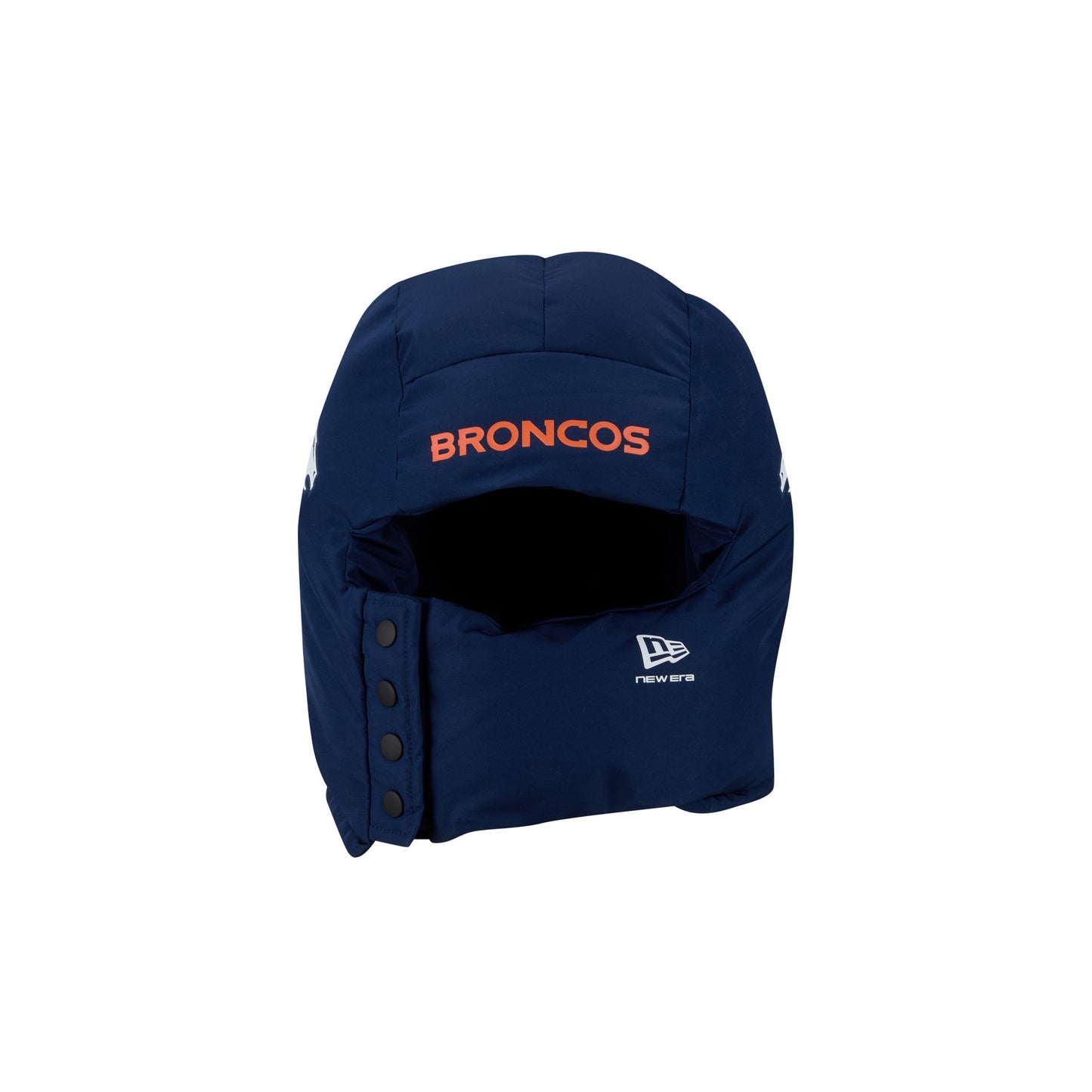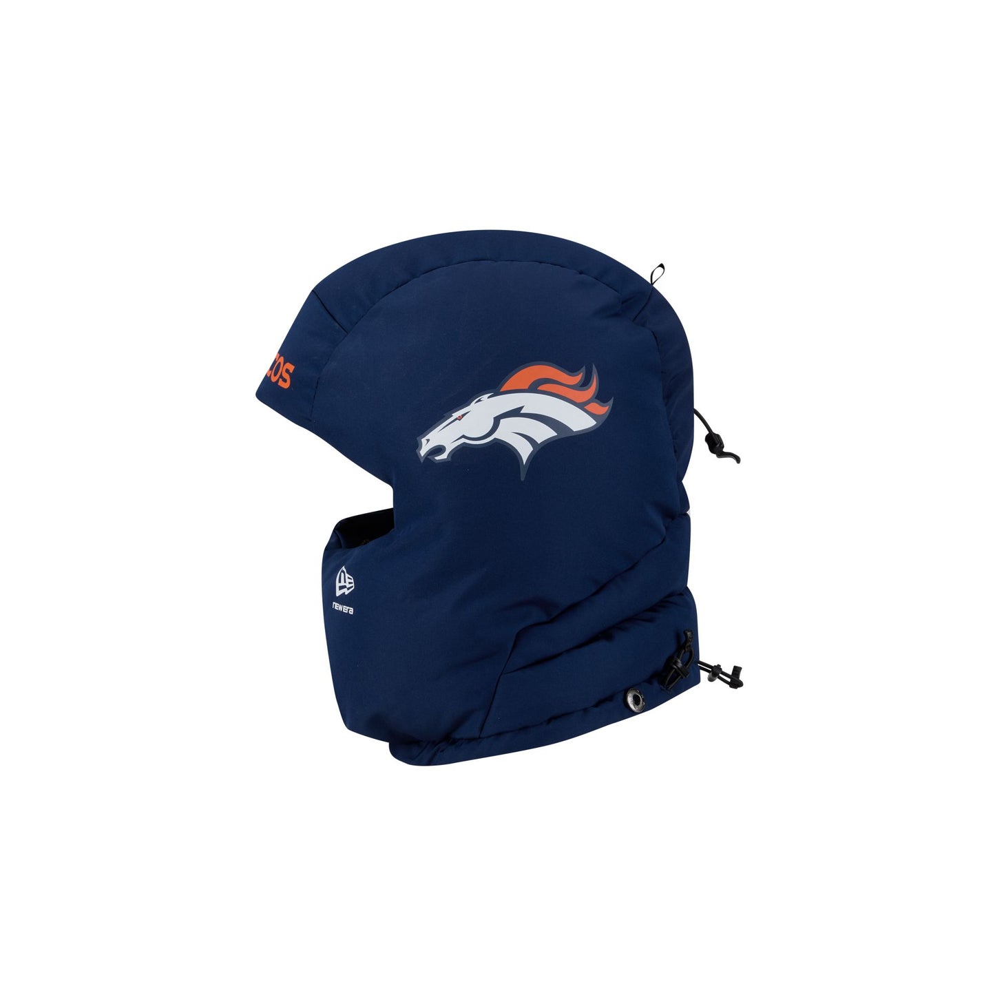 The Denver Broncos Helmet Puffer Hood features an embroidered Broncos wordmark at the front with a helmet design at each side. Additional details include an insulated filling with adjustable drawstrings at the back of the head and neck. The puffer helmet has a 4 snap-button closure at the right.