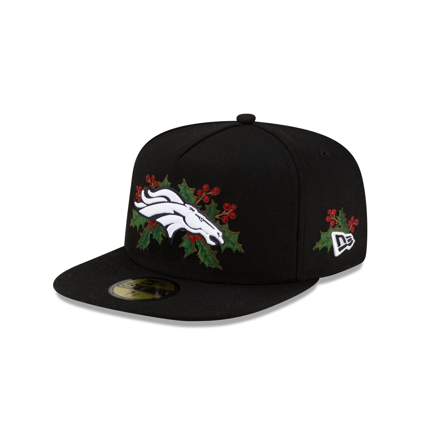 The Denver Broncos Holly 59FIFTY A-Frame Fitted Cap features an embroidered Broncos black and white logo with holly at the front panels with a matching NFL Shield logo at the rear. Additional details include a holly New Era Flag at the left-wear side and a black undervisor.