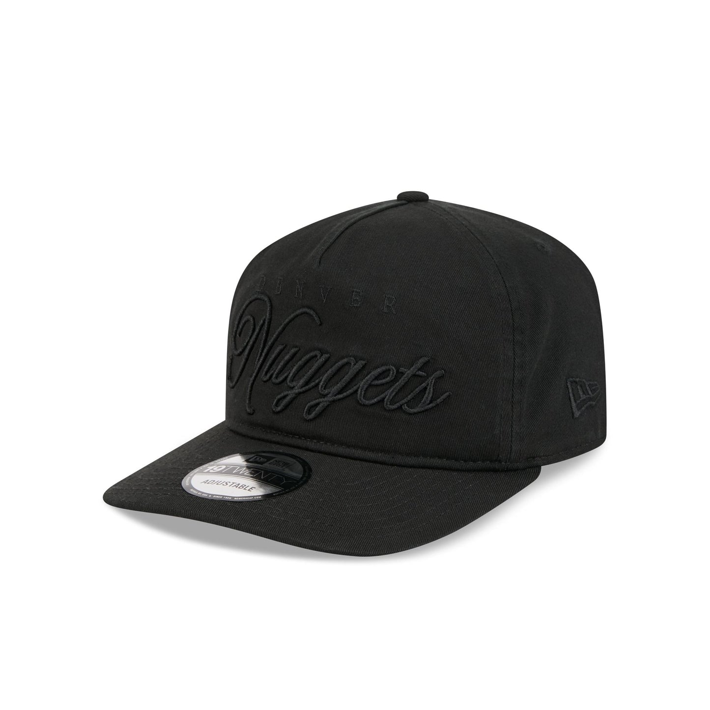 The Denver Nuggets All Black Scripted 19TWENTY Adjustable Cap features an embroidered Nuggets all black script wordmark at the front panels with a matching team logo at the right-wear side. Additional details include an adjustable snapback closure at the rear and a gray undervisor.