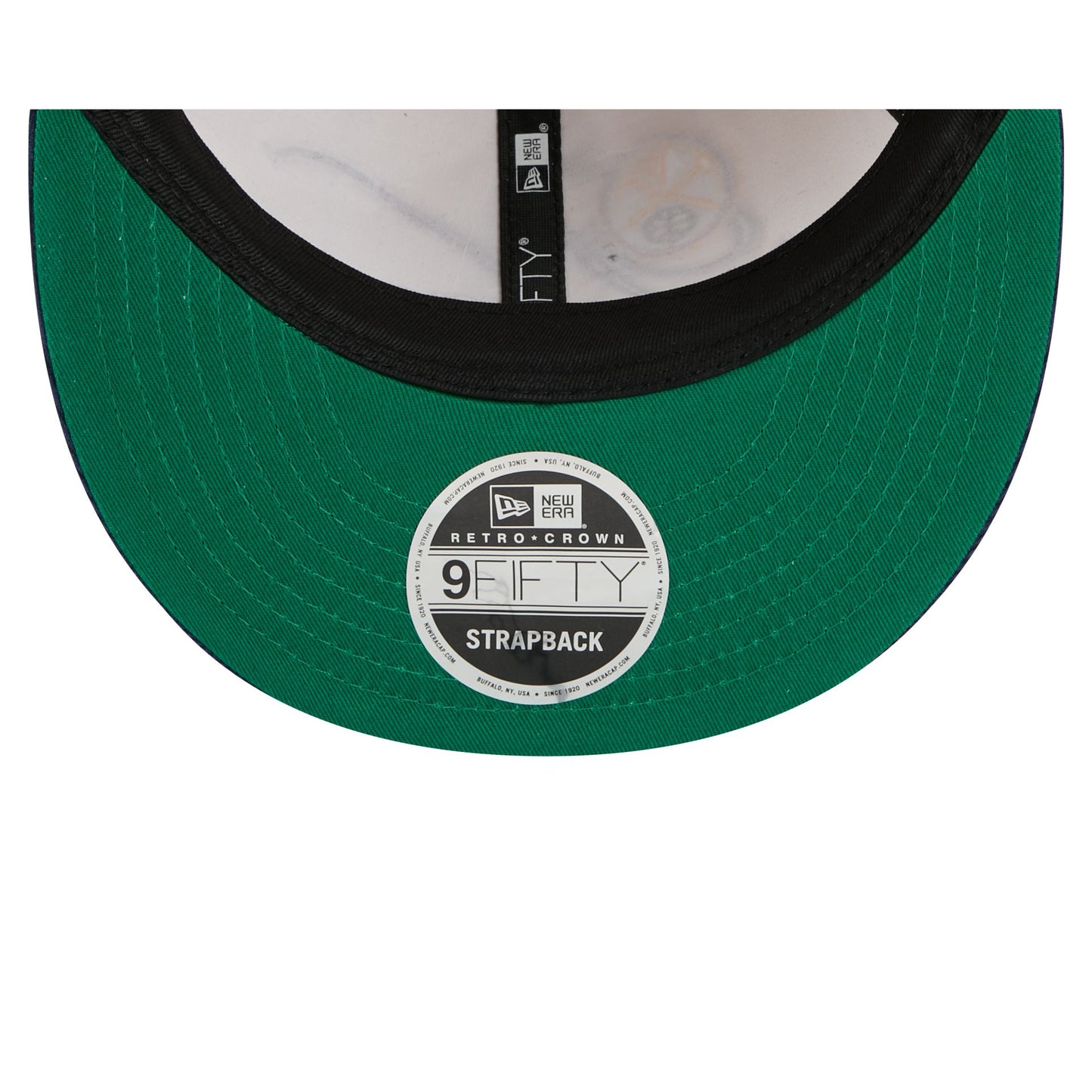 The Denver Nuggets Pinstripe Script Retro Crown 9FIFTY Adjustable Cap features an embroidered Nuggets logo and cursive wordmark at the front panels wit an adjustable belt closure at the rear and a green undervisor.