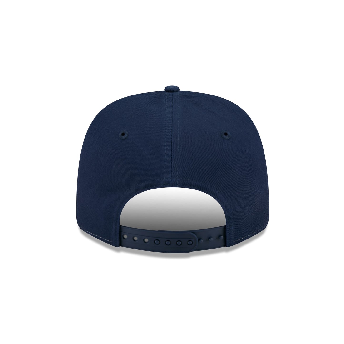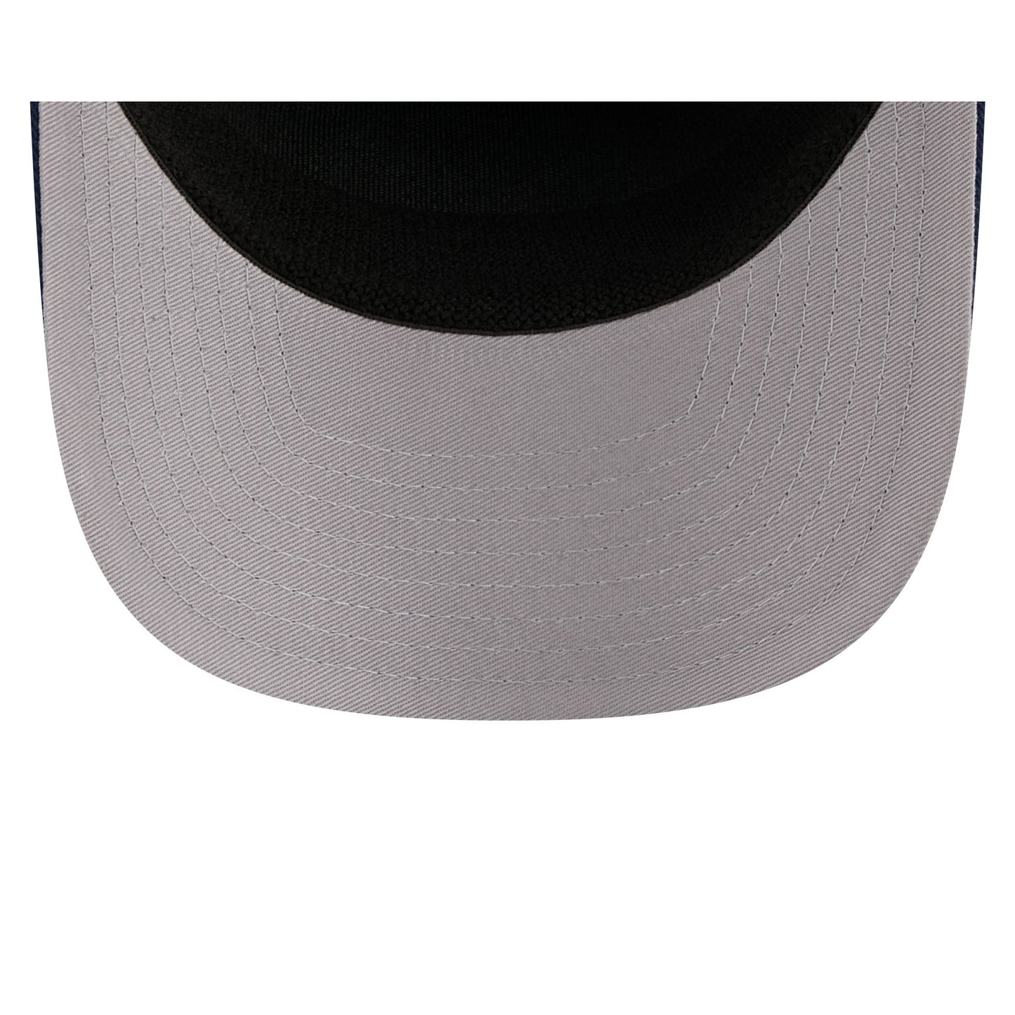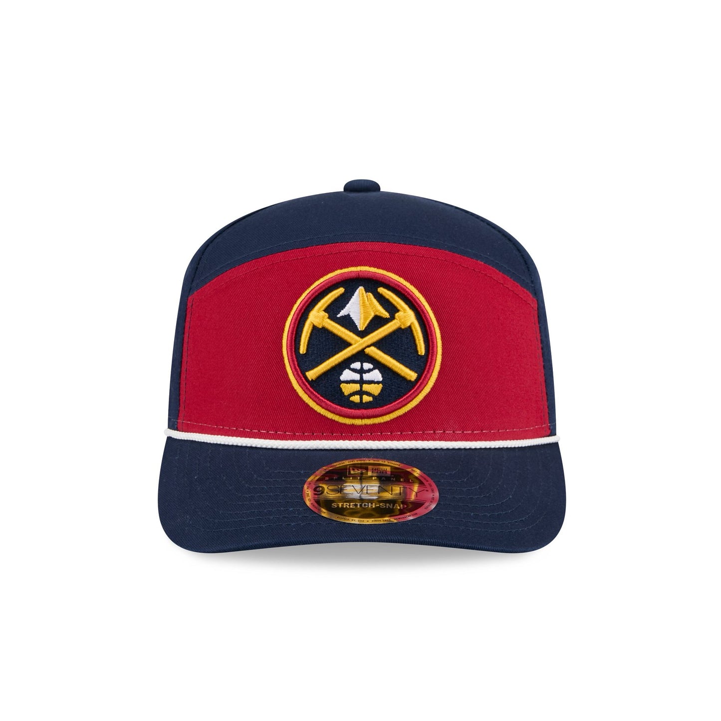 The Denver Nuggets Split Panel 9SEVENTY Stretch-Snap features an embroidered Nuggets logo at the front panel with a split crown construction and a rope at the visor. Additional details include an adjustable stretch-snap closure at the rear and a gray undervisor.
