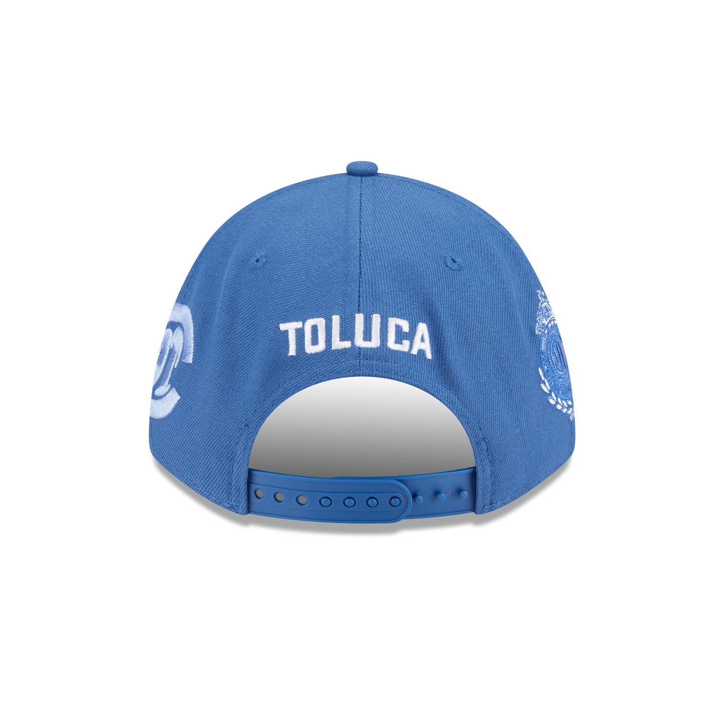 The Deportivo Toluca FC Indigo 9FORTY M-Crown A-Frame Trucker features the Toluca primary logo embroidered at the front panel with alternate team logos throughout the crown, a team wordmark above a snapback closure at the rear, and a gray undervisor.