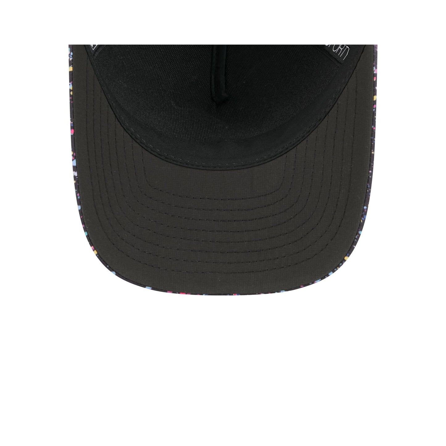 The Detroit Lions 2025 Crucial Catch 9FORTY M-Crown A-Frame Trucker features an embroidered Lions logo at the front paint splatter panels with a woven NFL Shield tag above a snapback closure at the rear. Additional details include a Crucial Catch Intercept Cancer patch at the right-wear side with performance mesh rear panels and a black undervisor.
