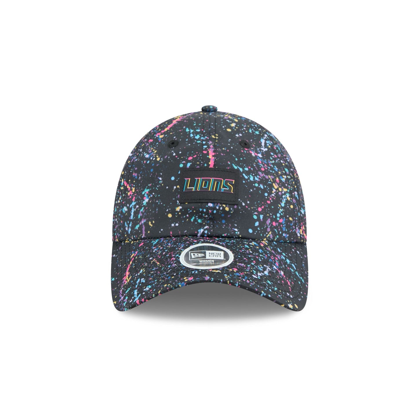 The Detroit Lions 2025 Crucial Catch Women's Open Back Ponytail Cap features a woven Lions logo at the front paint splatter panels with a Crucial Catch Intercept Cancer patch at the right-wear side and a black undervisor. Additional details include a woven NFL Shield tag at the rear with an adjustable strap and open back panel to accommodate any hairstyle.