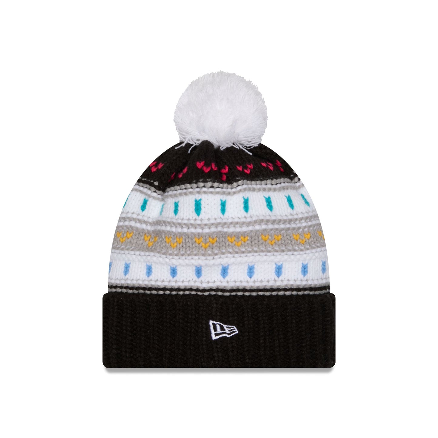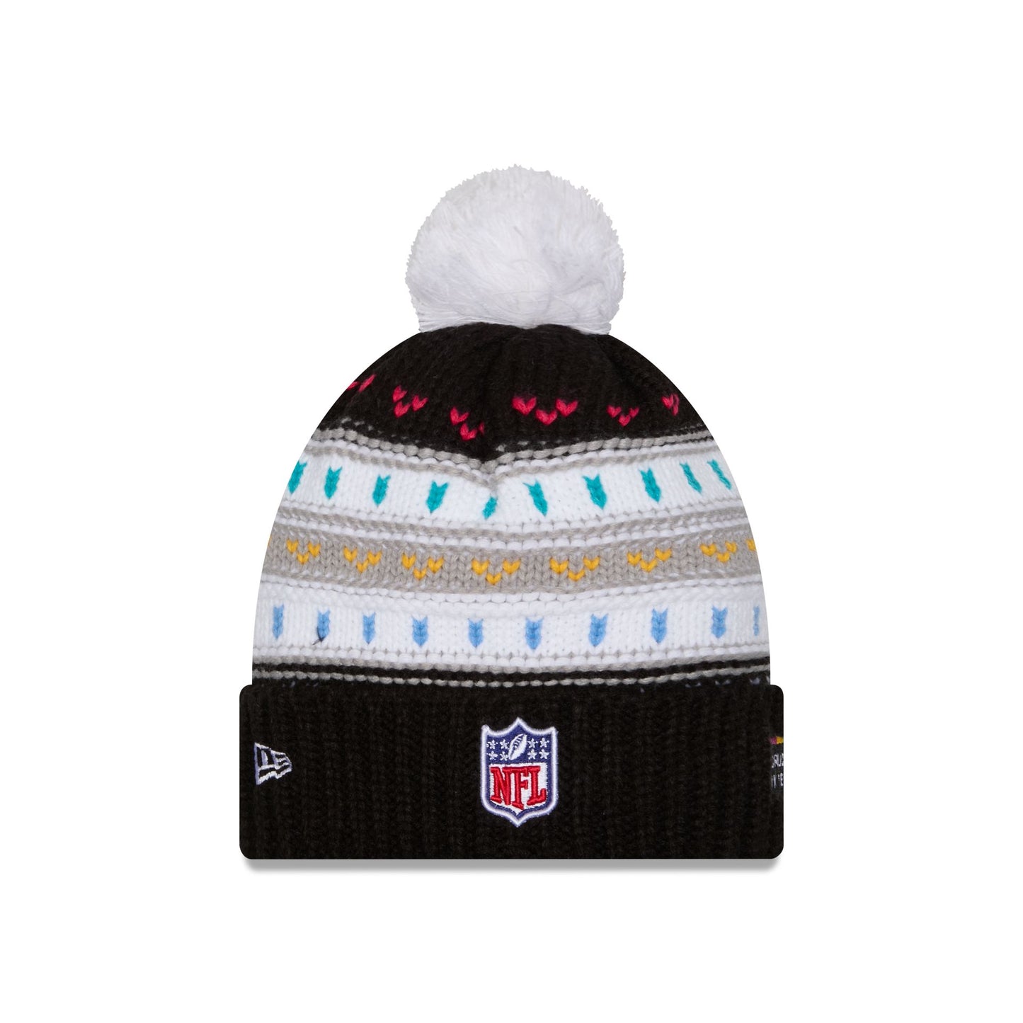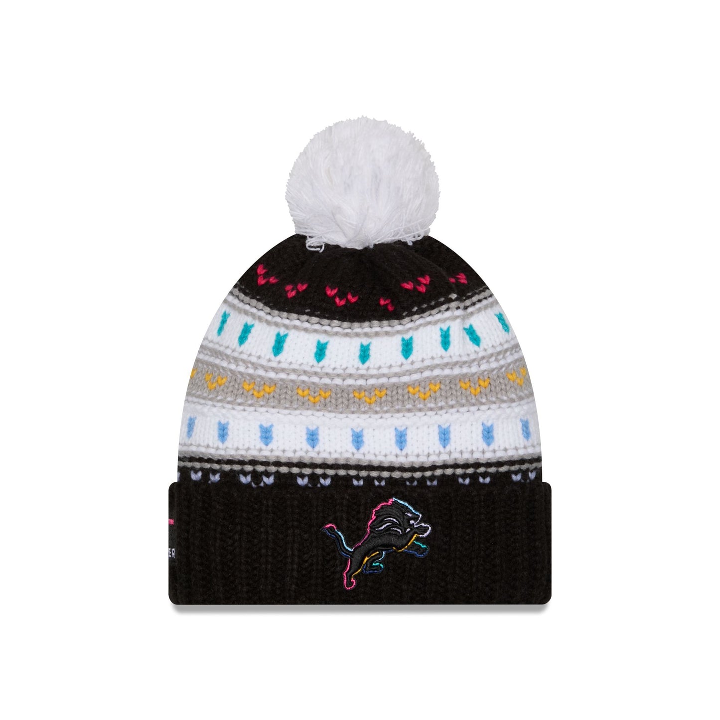 The Detroit Lions 2025 Crucial Catch Women's Pom Knit features an embroidered Lions logo at the front with an NFL Shield at the rear, a Crucial Catch Intercept Cancer patch at the right-wear side, and a one-time removeable pom.