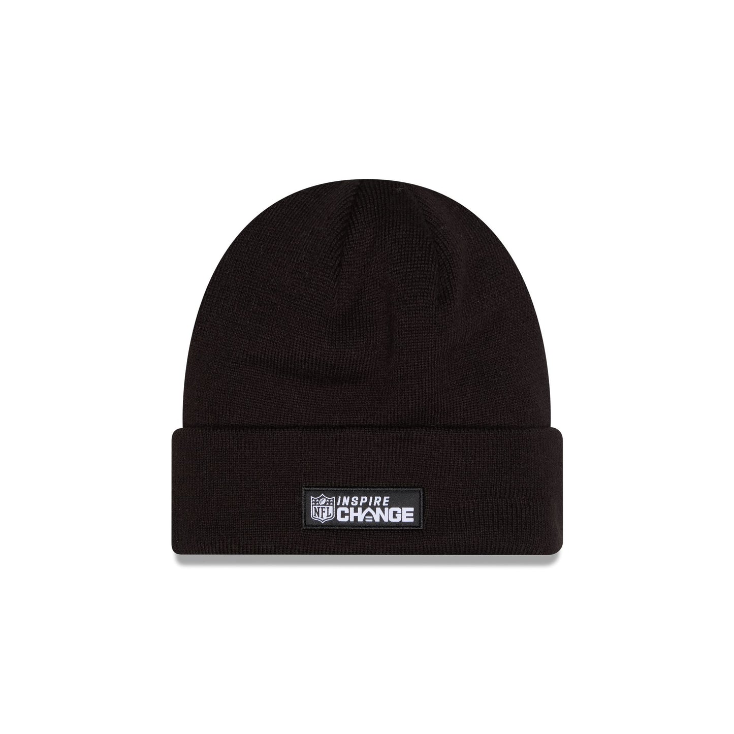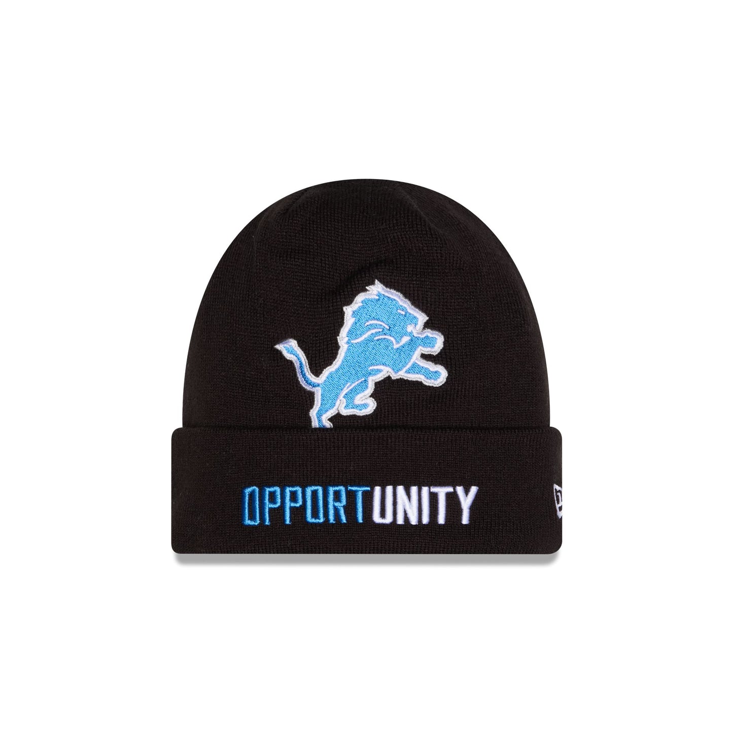 The Detroit Lions 2025 Inspire Change Beanie features an embroidered Lions logo at the front crown and matching "Opportunity" wordmark at the front cuff with an NFL Inspire Change patch at the rear.