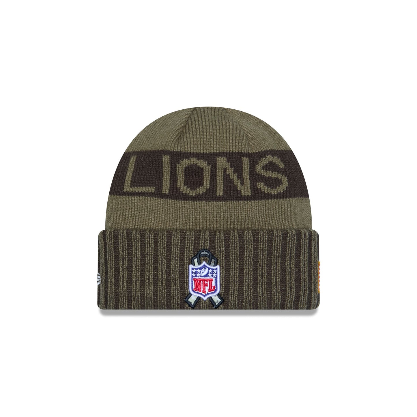 The Detroit Lions 2025 Salute to Service Cuff Knit features an embroidered Lions logo at the front with a team wordmark at the crown, an American flag patch at the right-wear side, and the official NFL Salute to Service patch at the rear.