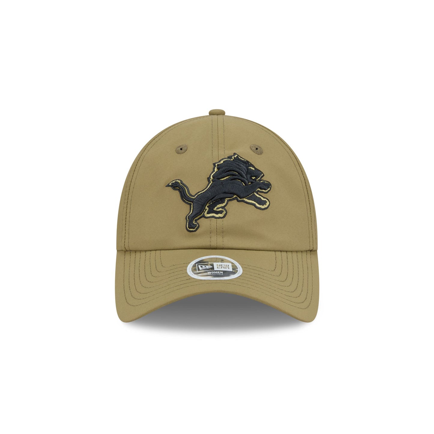 The Detroit Lions 2025 Salute to Service Women's Open Back Ponytail Cap features an embroidered Lions logo at the front panels with the official NFL Salute to Service patch at the right-wear side, a digi camo interior fabrication, and a dark green undervisor. Additional details include an adjustable strap and open panel at the rear to accommodate any hairstyle.