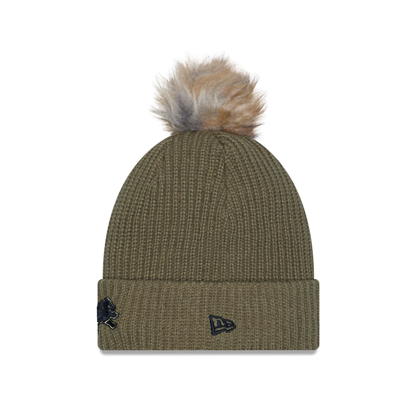 The Detroit Lions 2025 Salute to Service Women's Pom Knit features an embroidered Lions logo at the front with an American flag patch at the right-wear side, the official NFL Salute to Service patch at the rear, and a one-time removeable pom.