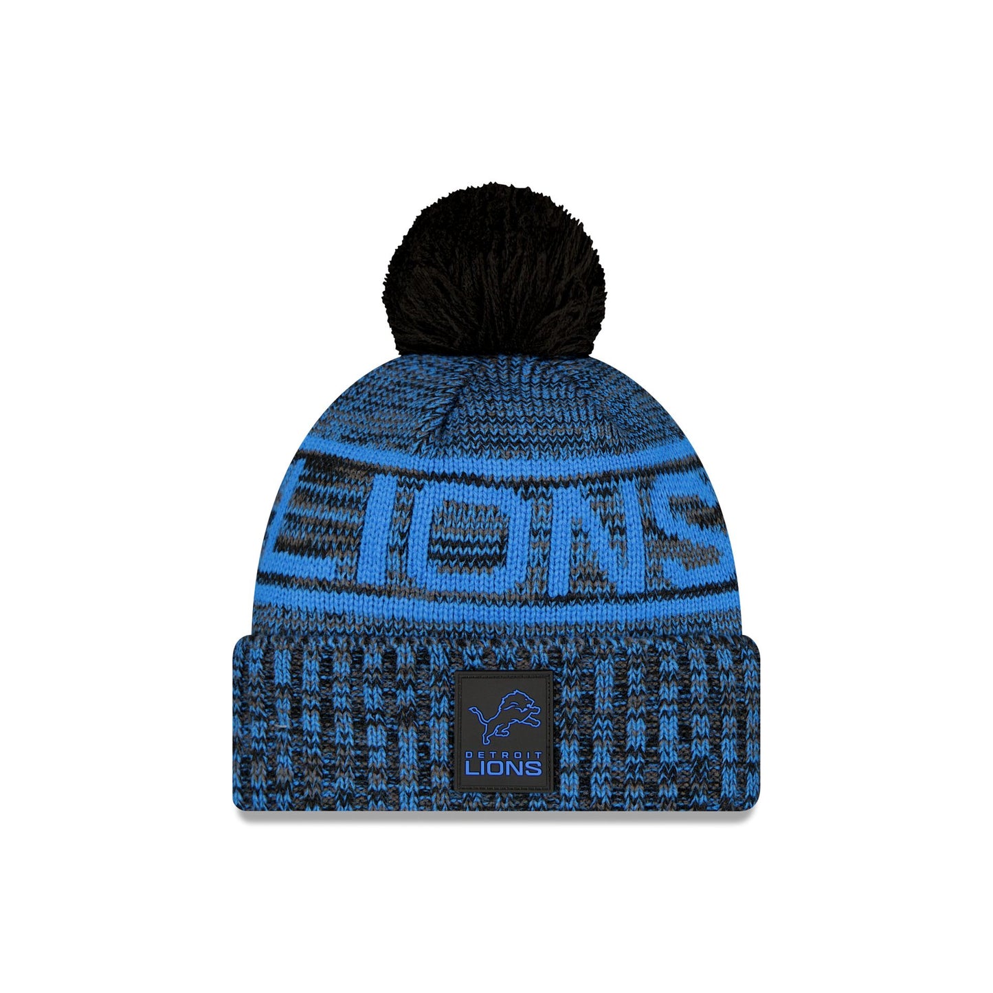 The Detroit Lions 2025 Sideline Cold Weather Black Pom Knit Hat features a sewn-down silicone Lions black logo patch at the front cuff with a matching Official NFL Shield logo at the rear. Additional details include a team wordmark across the crown, a one-time removeable black pom, and a fleece lining.