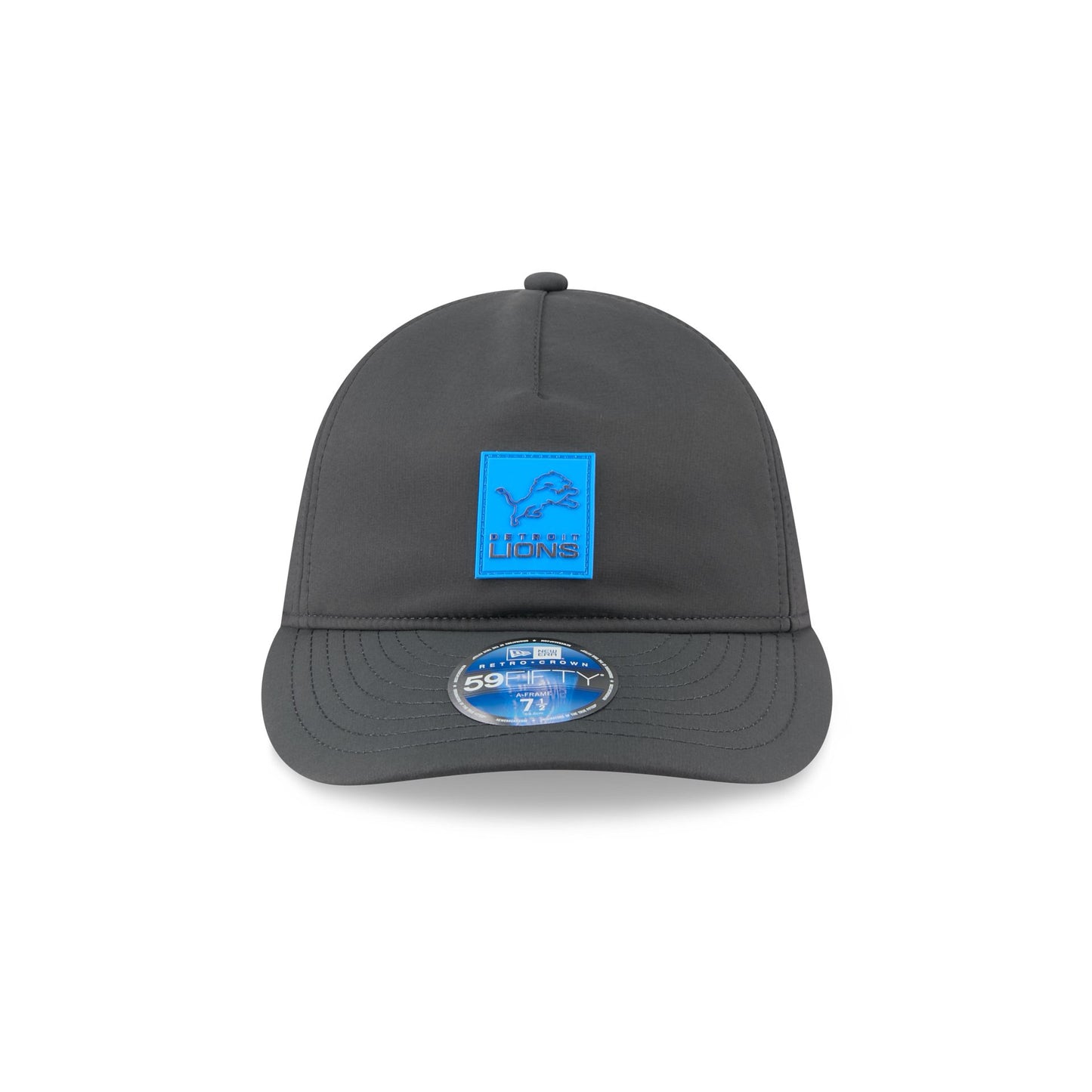 The Detroit Lions 2025 Sideline Cold Weather Steel Clouds Retro Crown 59FIFTY A-Frame Fitted Cap features a sewn-down silicone Lions logo patch at the front panels with the Official NFL Shield logo at the rear. The cap has a water-repellent quill tech fabrication throughout, with an insulated crown and quick-dry cushioned sweatband. The undervisor is accented with a silicone transfer in the team’s colors.