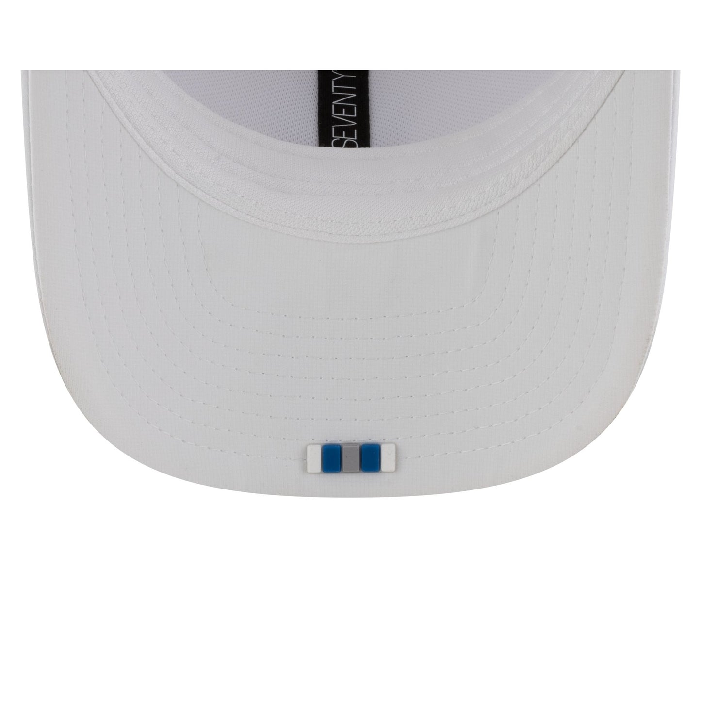 The Detroit Lions 2025 Sideline Hot Weather White 9SEVENTY Trucker features a sewn-down silicone Lions logo patch at the front panels with a water-repellent quill tech fabrication throughout and a quick-dry cushioned sweatband to absorb moisture. Additional details include the Official NFL Shield logo to the right of a soft silicone snapback closure at a light-weight mesh rear. The undervisor is accented with a silicone transfer in the team’s colors.