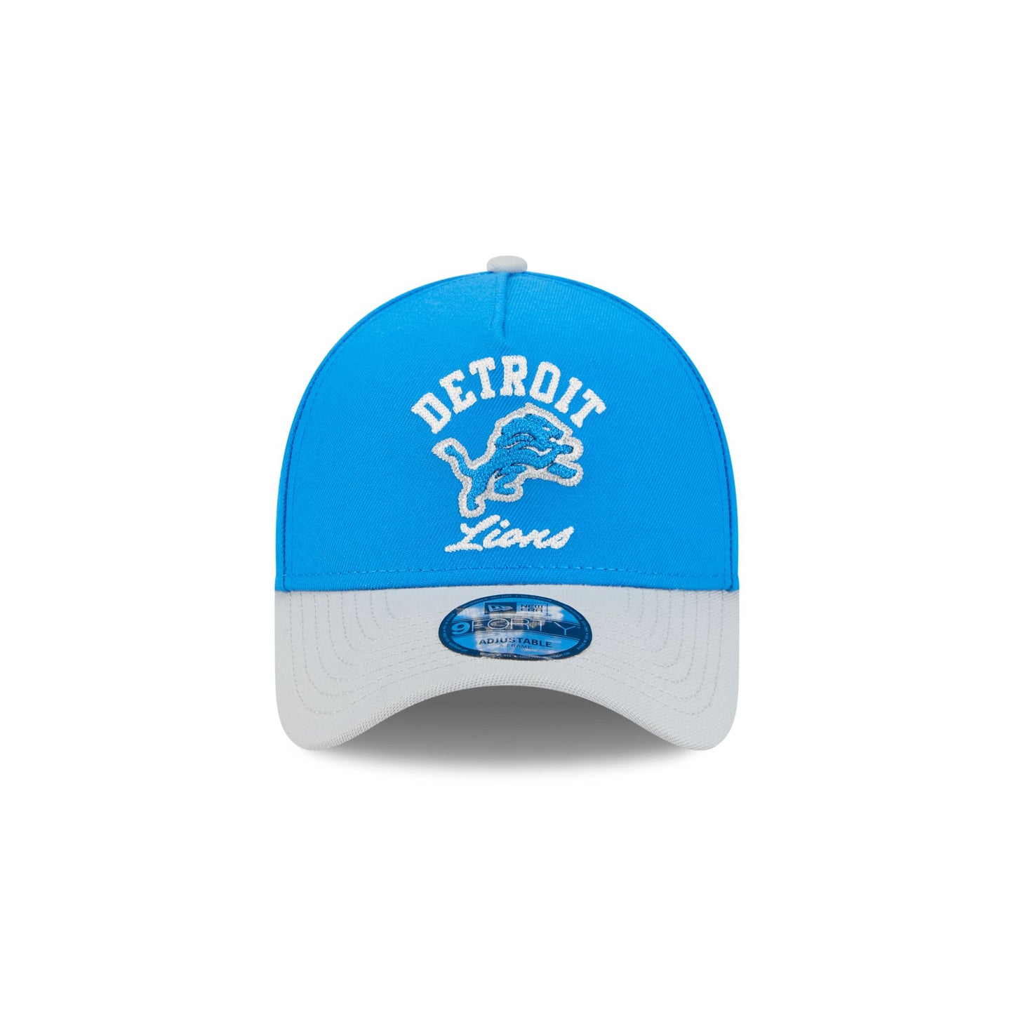 The Detroit Lions Arched 9FORTY A-Frame Snapback features an embroidered Lions arched logo graphic at the front panels with a team graphic at the right-wear side. Additional details include the establishment date above an adjustable snapback closure at the rear and a gray undervisor.