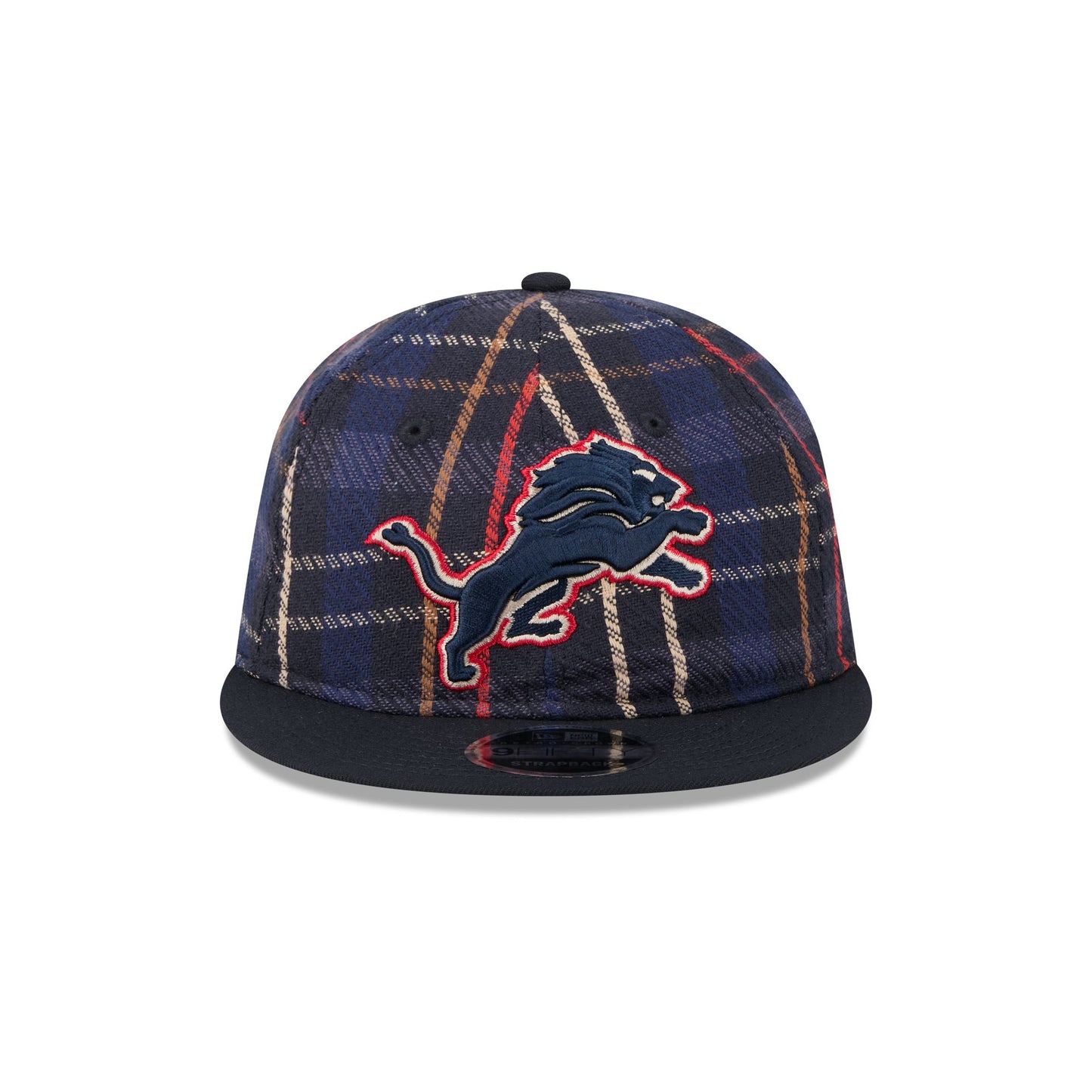The Detroit Lions Grunge Plaid Retro Crown 9FIFTY Adjustable Cap features an embroidered Lions logo at the front panels with an adjustable leather strap closure at the rear and a navy undervisor.