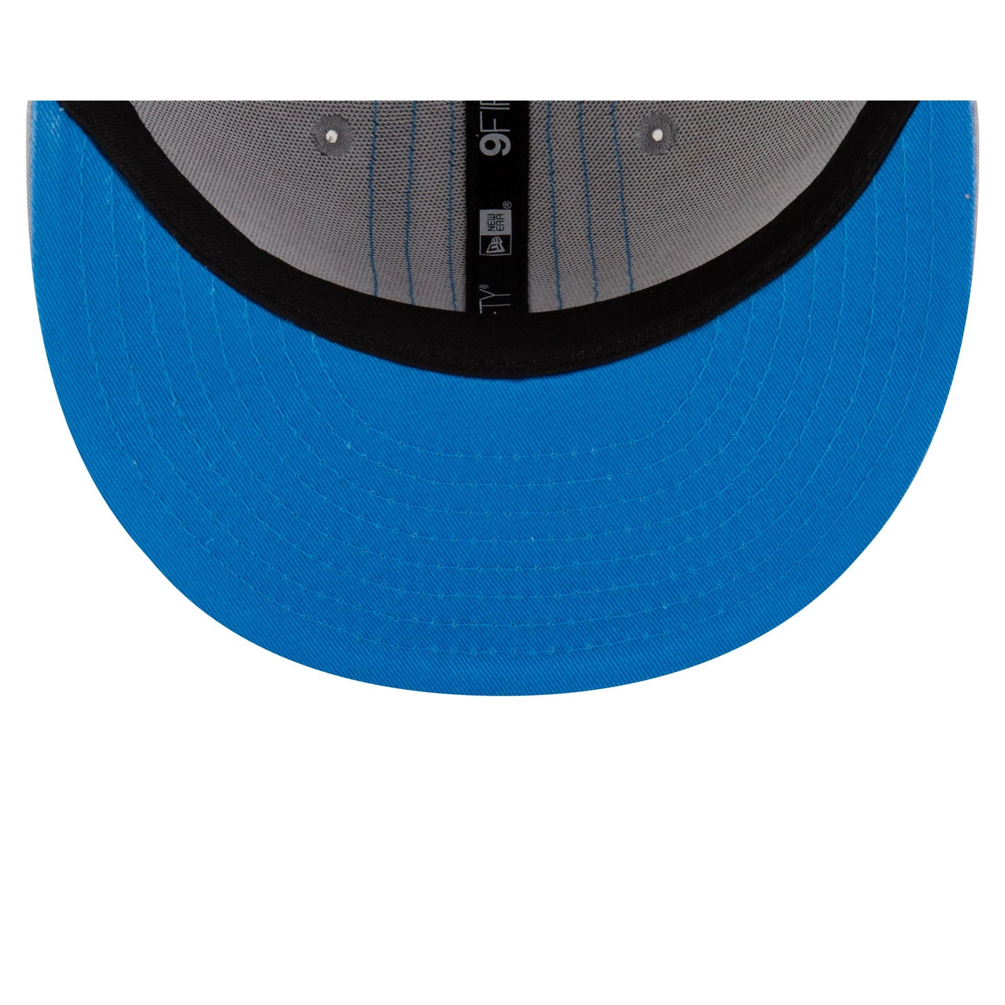 The Detroit Lions Helmet Pack 9FIFTY Snapback features an embroidered fabric applique Lions replica helmet design at the crown with a matching woven team logo tag at an adjustable snapback closure at the rear and a blue undervisor.
