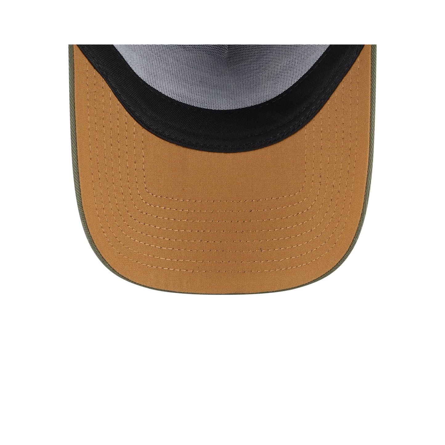The Detroit Lions Navy 9FORTY A-Frame Snapback features an embroidered Lions logo at the front panels with a snapback closure at the rear. Additional details include a 75 Seasons patch at the right-wear side, a olive green visor, and a tan undervisor.