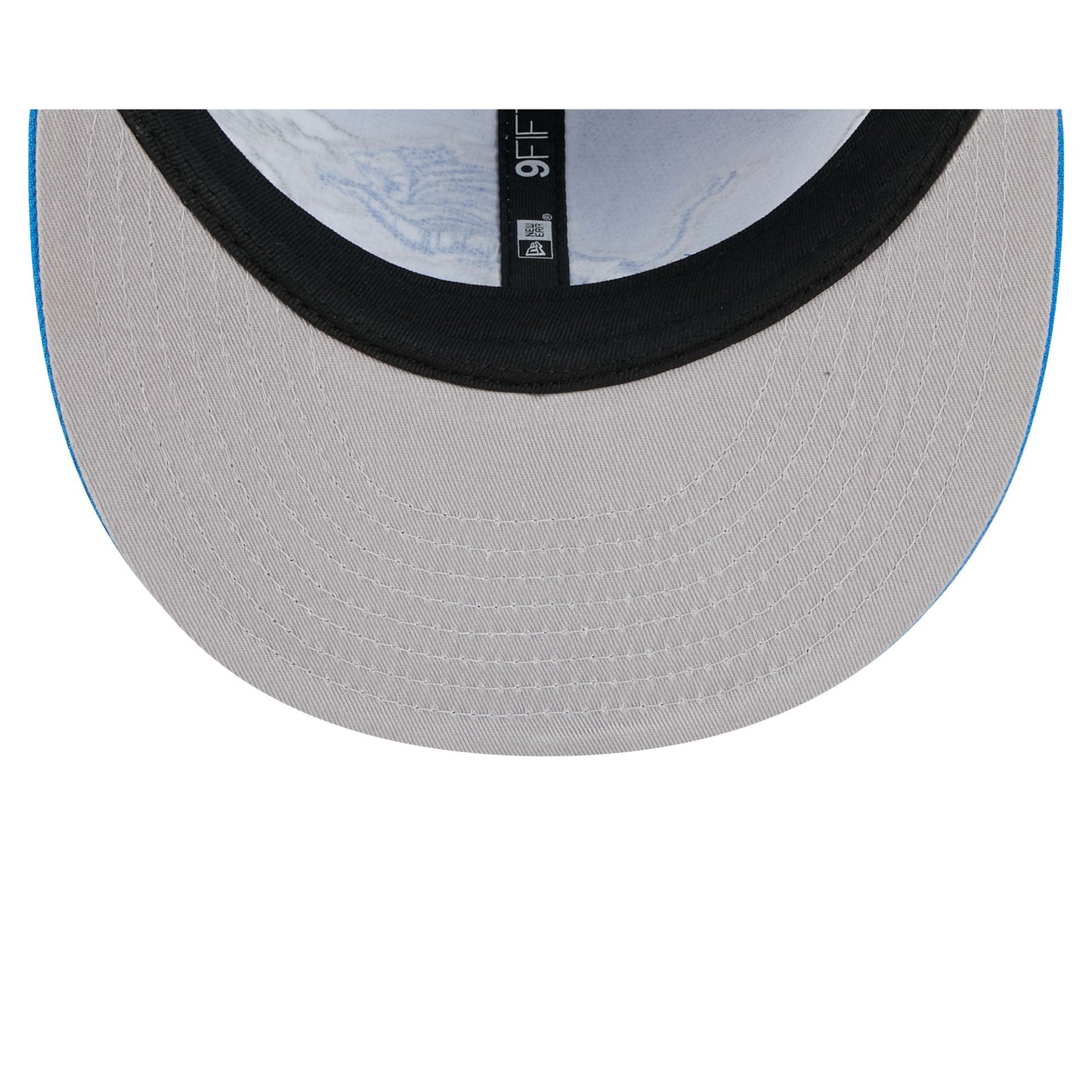 The Detroit Lions Tidal Flow Retro Crown 9FIFTY Adjustable Cap features an embroidered Lions logo at the front panels with tidal waves throughout the cap. Additional details include an adjustable snapback closure at the rear and a gray undervisor.