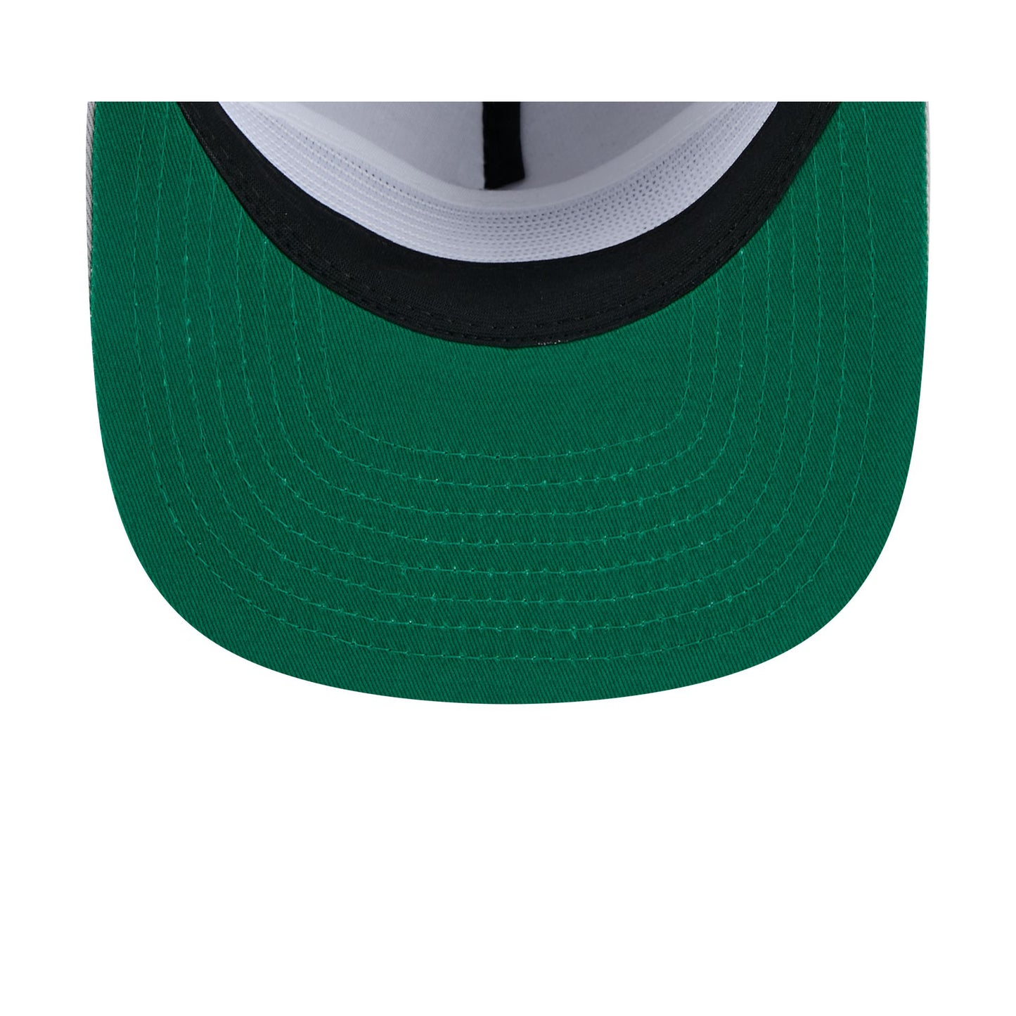 The Detroit Lions Vintage Gray Golfer features an embroidered "PROPERTY OF" Lions wordmark at the front panels with a team logo at the right-wear side and a rope at the visor. Additional details include a snapback closure at the rear and a green undervisor.