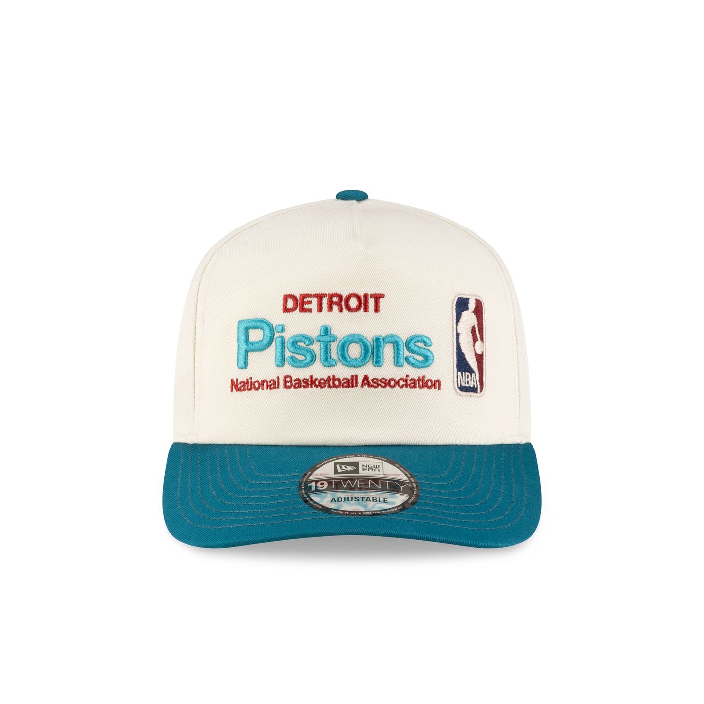 The Detroit Pistons 1996-2001 Hardwood Classics Sign Stack Chrome White 19TWENTY Adjustable Cap features an embroidered Pistons 1996-2001 Hardwood Classics logo at the right-wear side with a matching digital text and NBA Logoman at the front panels. Additional details include an adjustable snapback closure at the rear and a green undervisor.